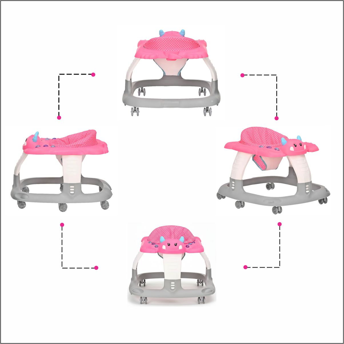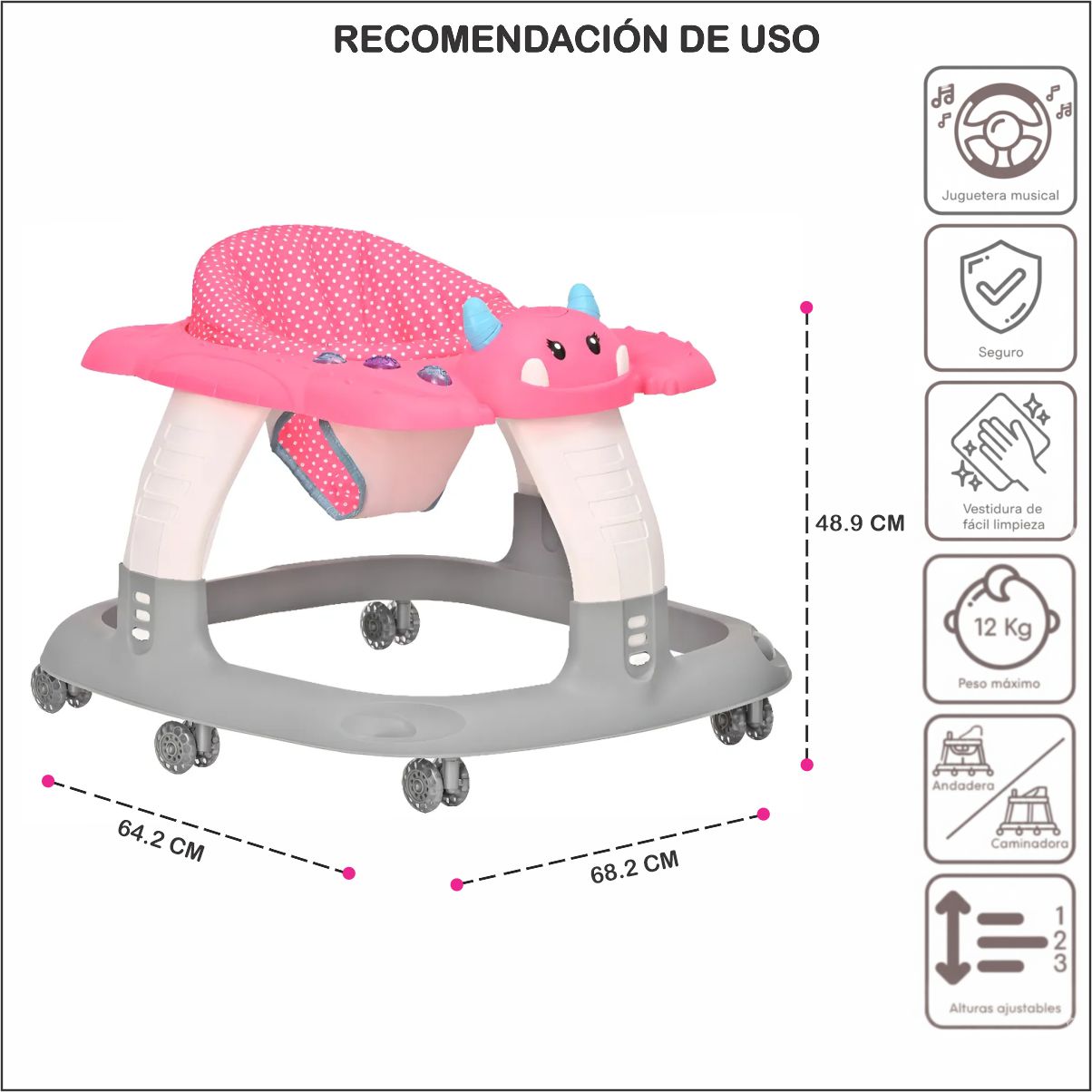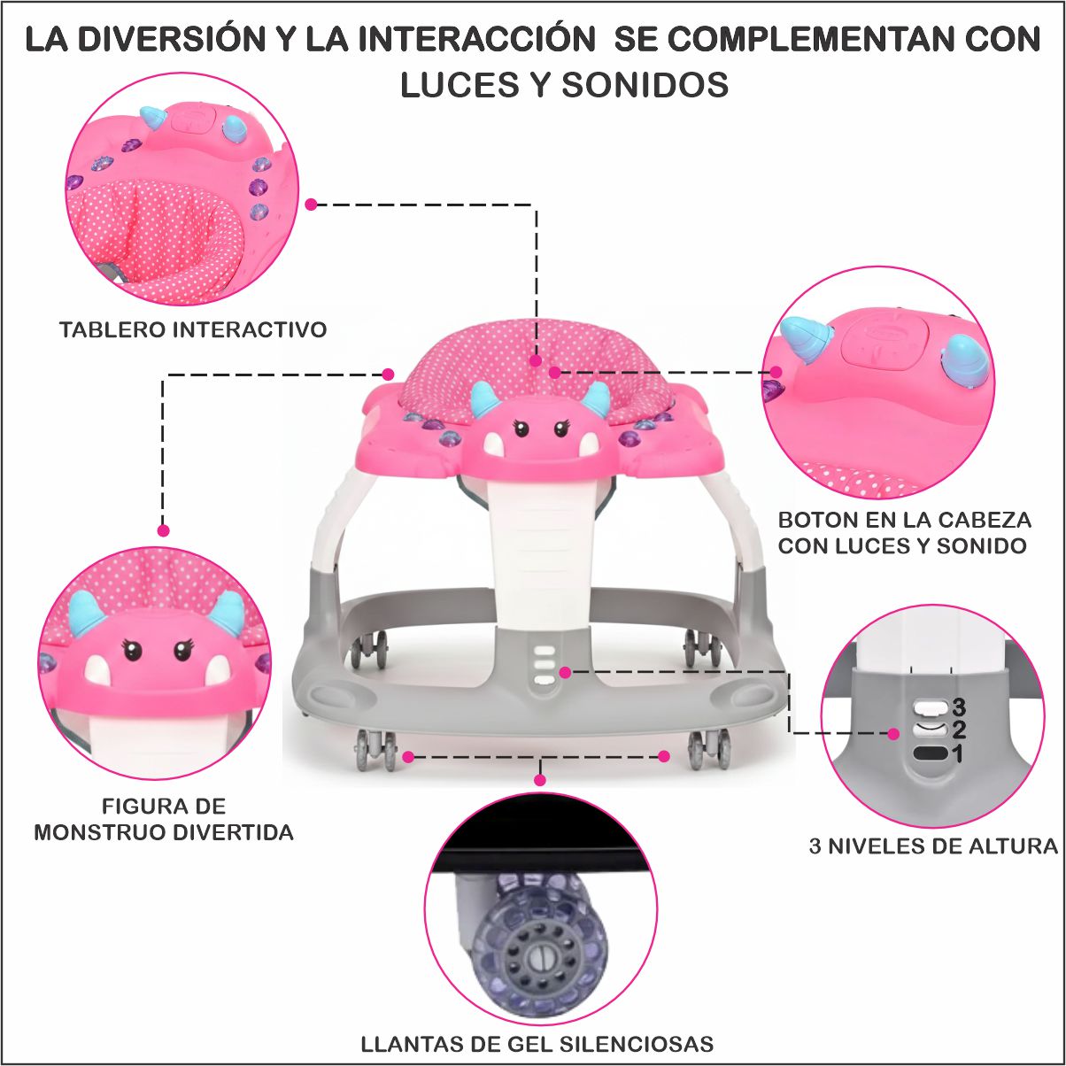 La andadera para bebé es el acompañante ideal para los primeros pasos de tu pequeño. Diseñada con un tablero interactivo que incluye luces y sonidos, captura la atención del bebe y lo motiva a explorar. Además, cuenta con accesorios mecánicos que favorecen la coordinación ojos, manos, estimulando su desarrollo mientras juega.