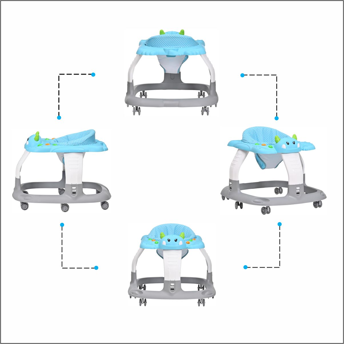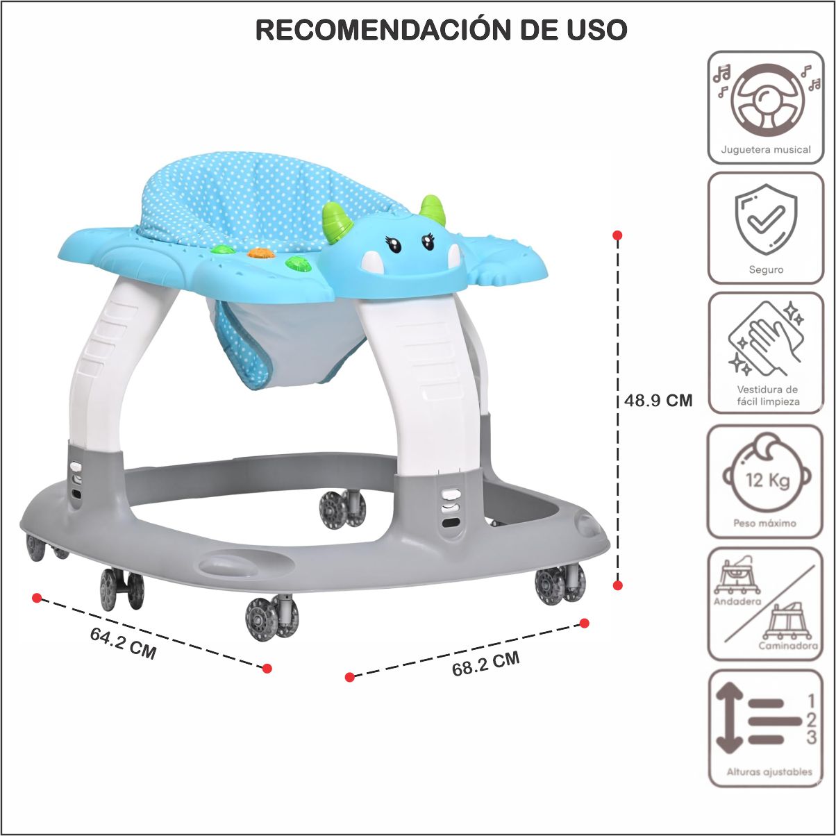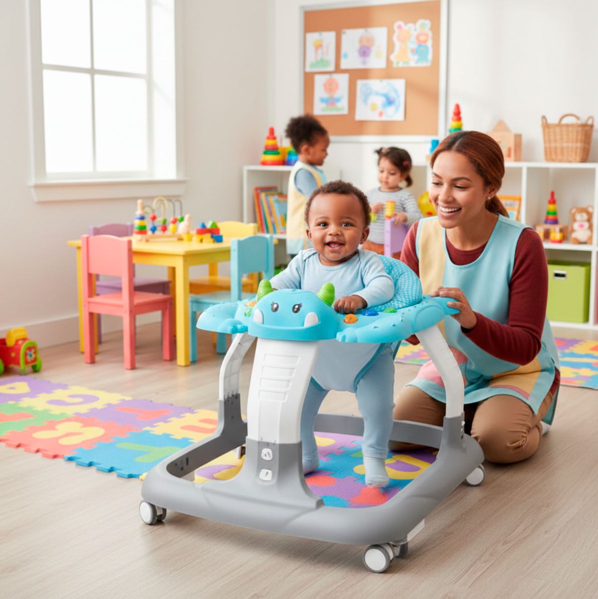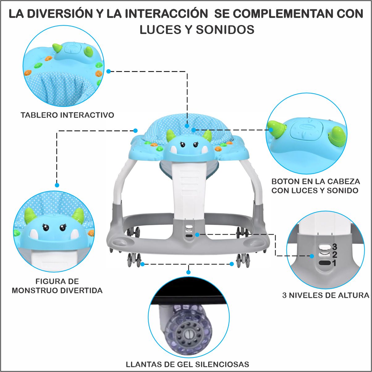La andadera para bebé es el acompañante ideal para los primeros pasos de tu pequeño. Diseñada con un tablero interactivo que incluye luces y sonidos, captura la atención del bebe y lo motiva a explorar. Además, cuenta con accesorios mecánicos que favorecen la coordinación ojos, manos, estimulando su desarrollo mientras juega.