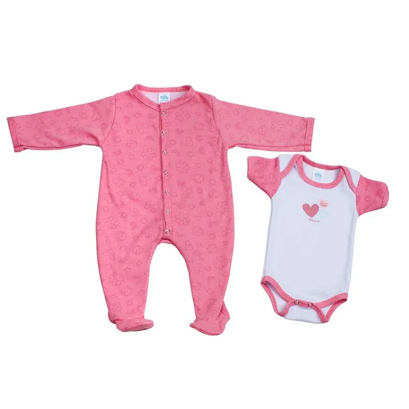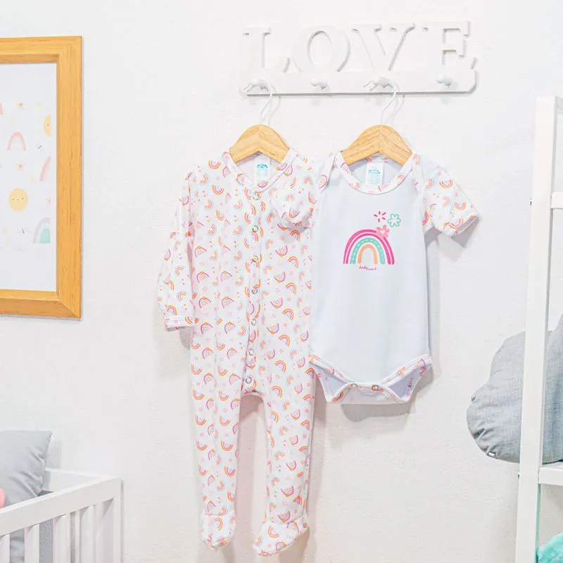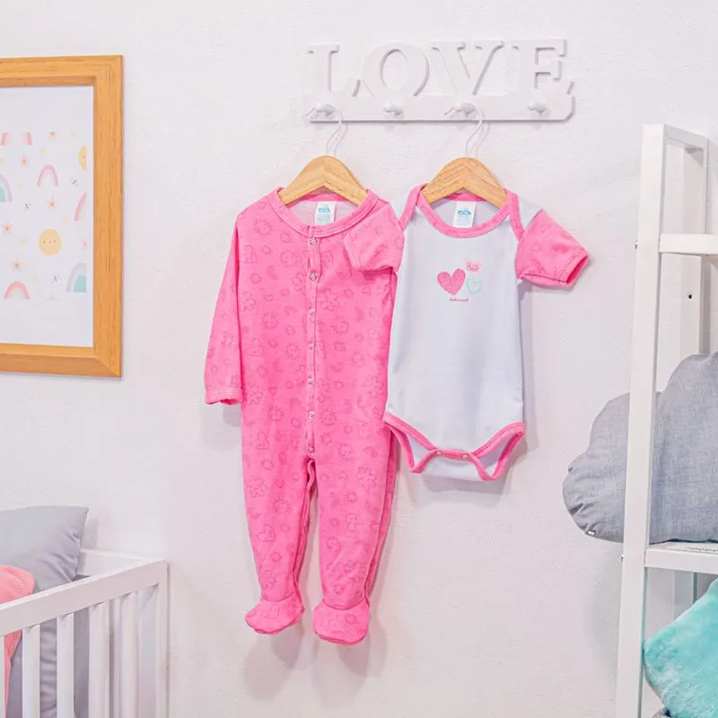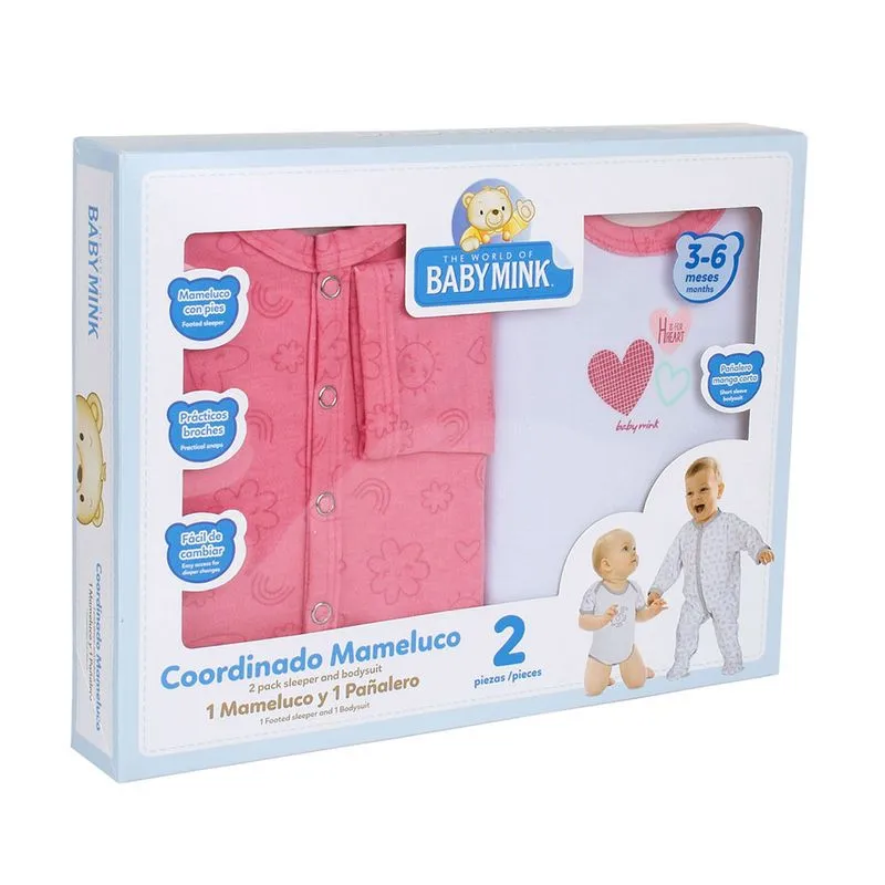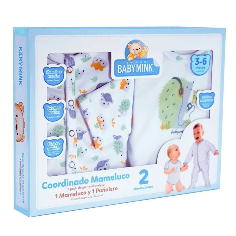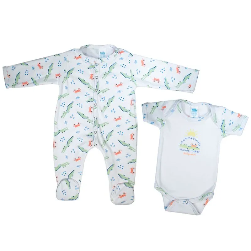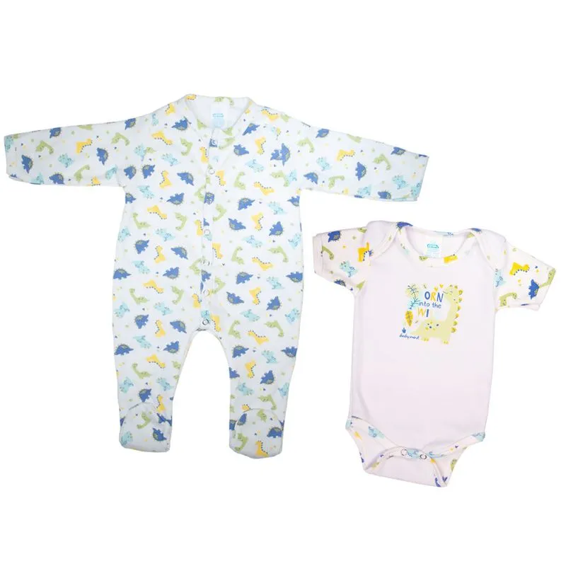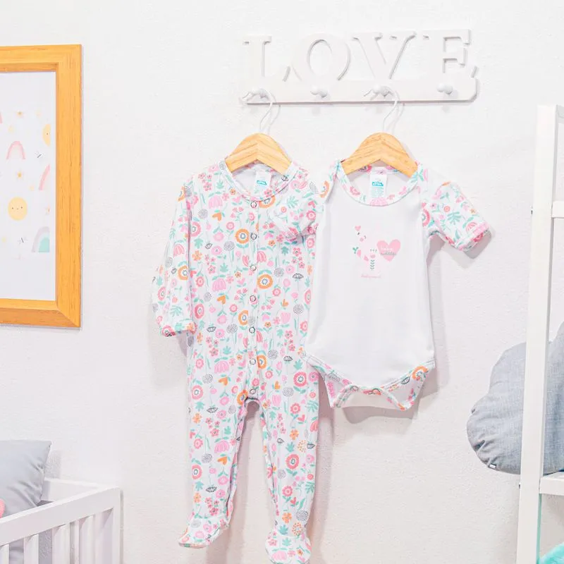 Incluye un mameluco de manga larga con pies cerrados para mantenerlo calientito y un pañalero de manga corta para los días más frescos o para combinar.
