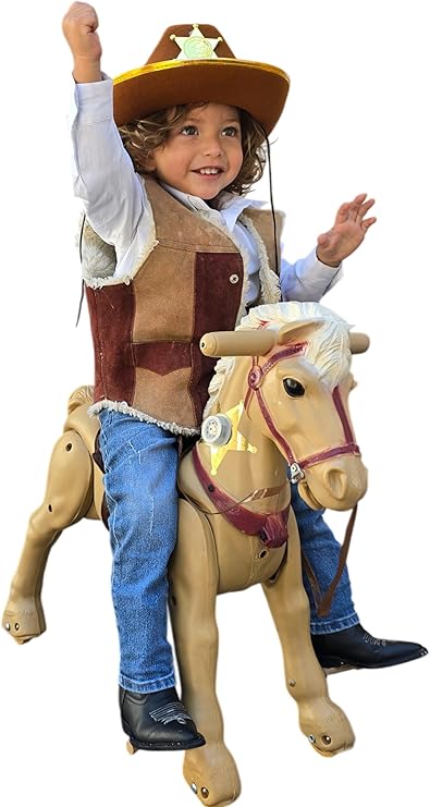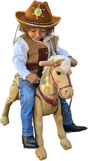 El juguete montable cuenta con ruedas en la parte inferior de las patas del caballo. El montable avanza con el impulso del niño. Cuenta con sonido. Incluye un sombrero.