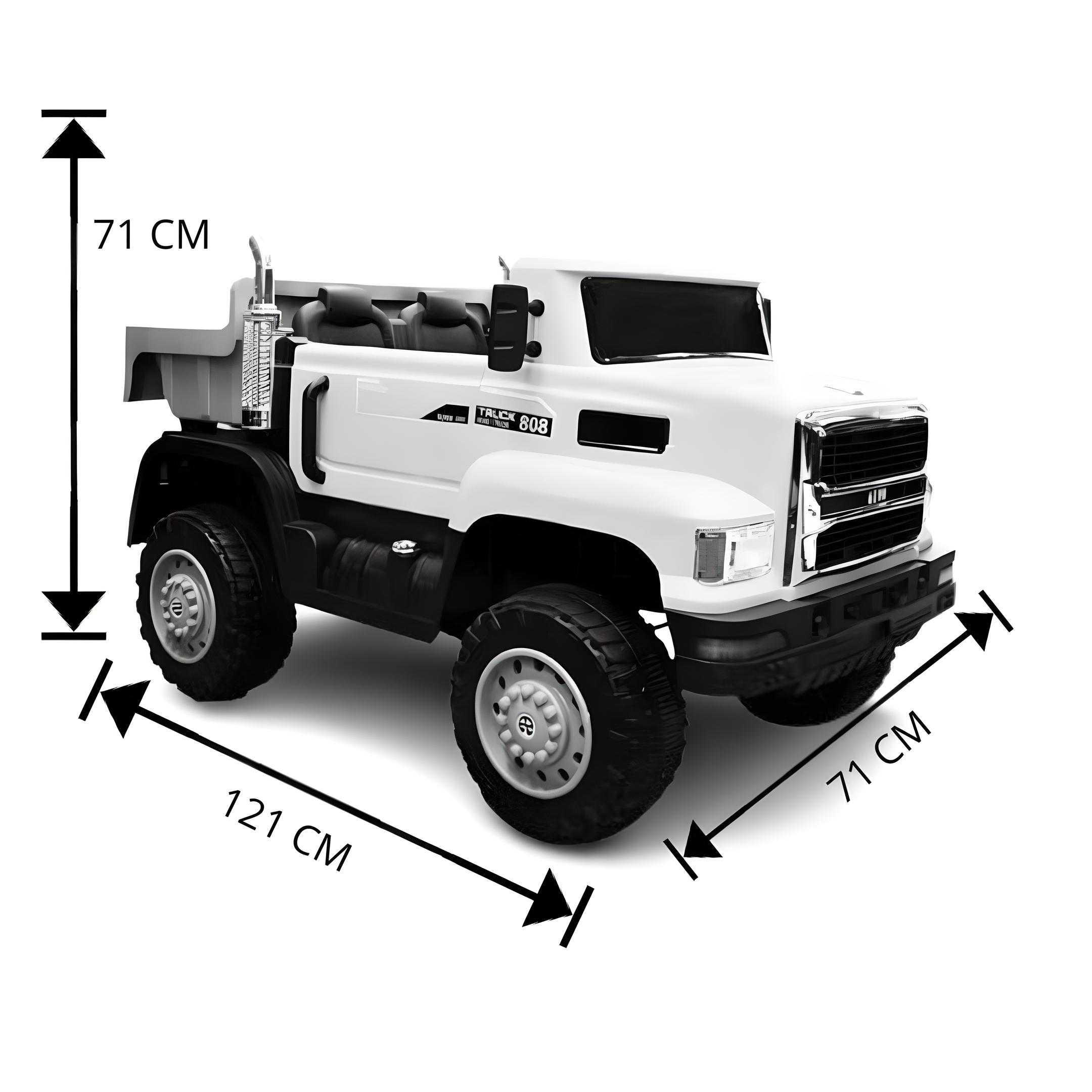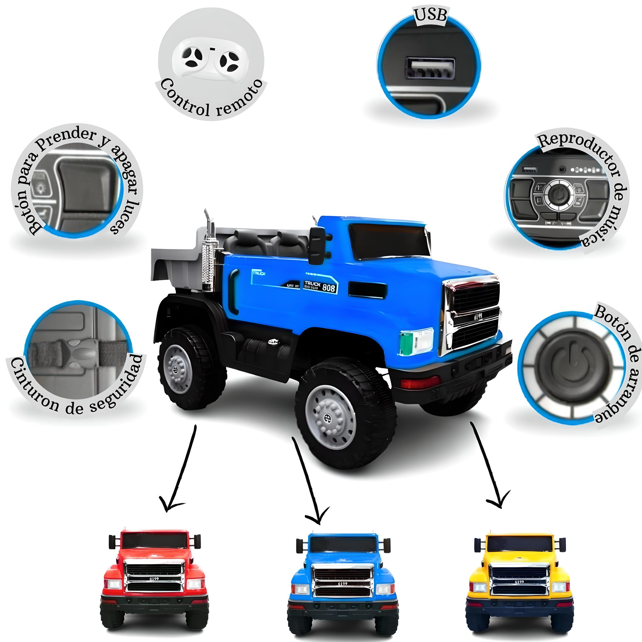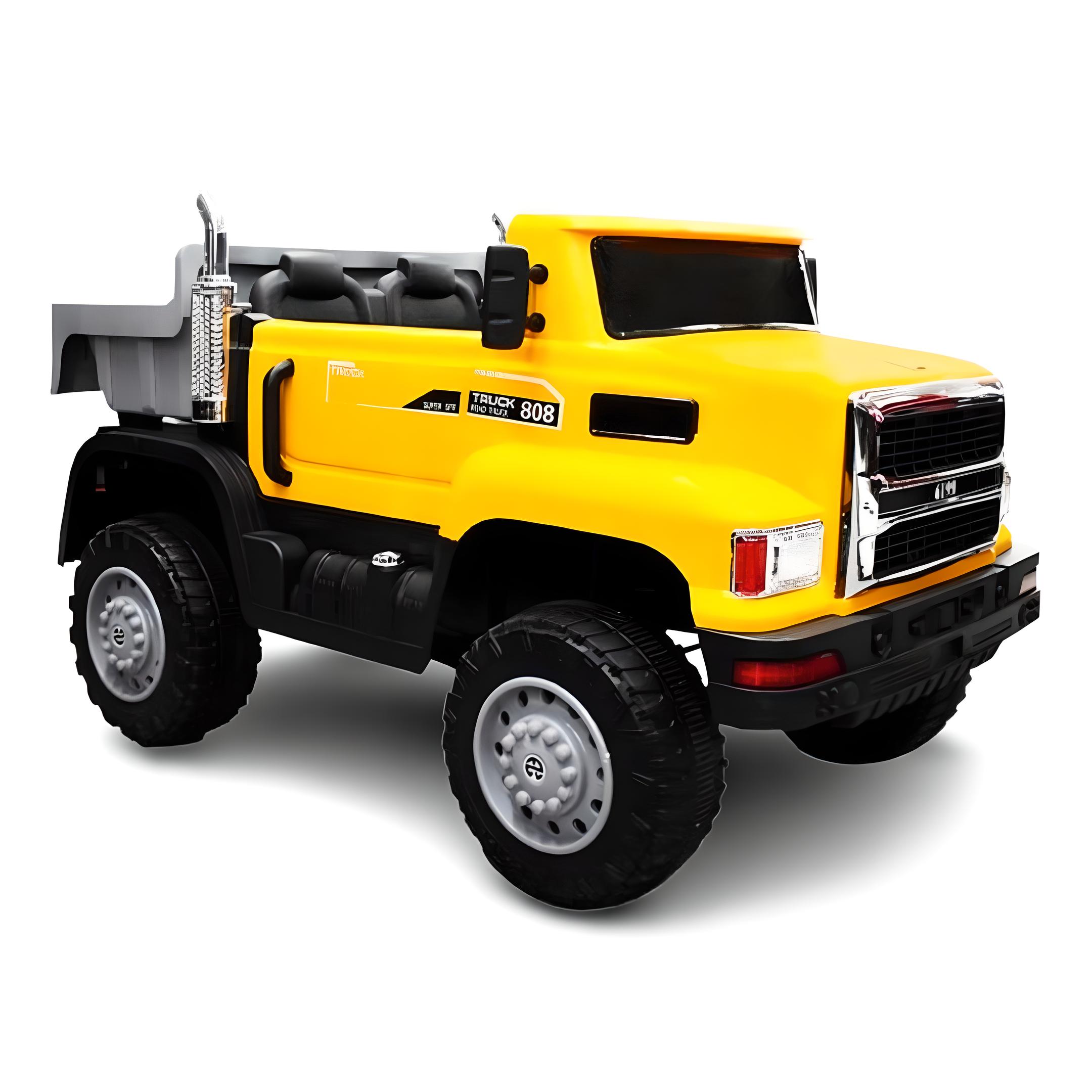 Camión volteo eléctrico infantil con batería de 12V y 4 motores, ideal para una conducción potente y segura.