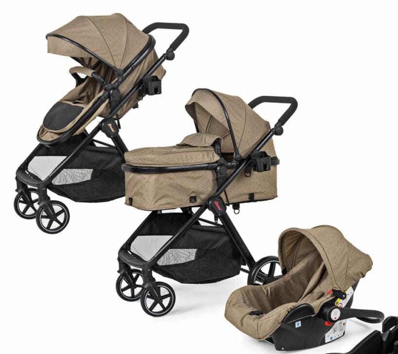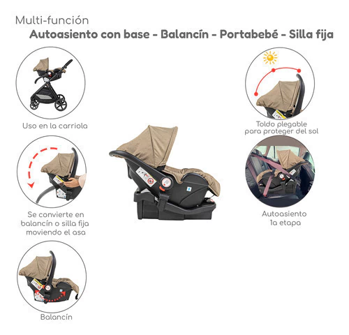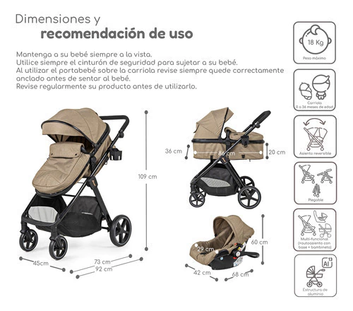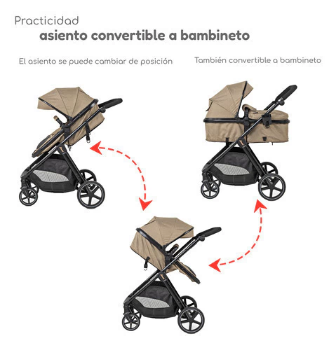 Sistema de viaje con prácticos detalles para paseos cómodos y seguros, en modernas combinaciones, incluye bambineto y autoasiento 1a etapa. Recomendada para bebés desde recién nacidos y niños hasta los 4 años. El bambineto se convierte fácilmente en asiento de la carriola, que es reversible y desmontable. El autoasiento puede sujetarse directamente al chasis de la carriola o usarse en el auto con bebés de hasta 1 año, funciona también como canastilla portabebé fuera de la carriola.