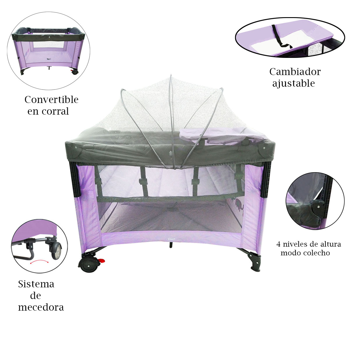 Cuna corral con velo mosquitero que cubre totalmente la cuna, con bolsa de viaje, ideal para espacios pequeños, con cambiador alto y espacio para guardar accesorios.