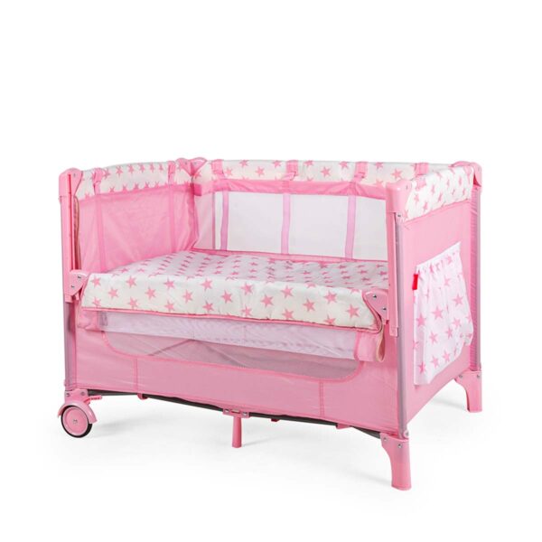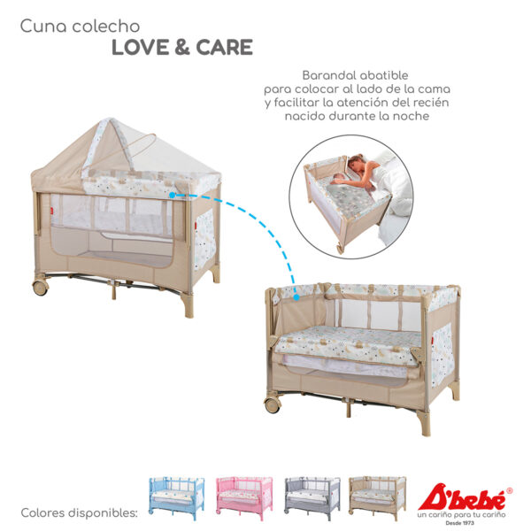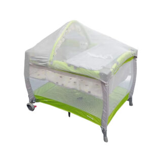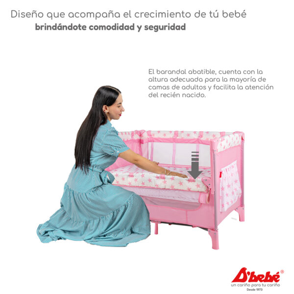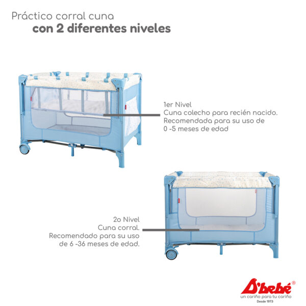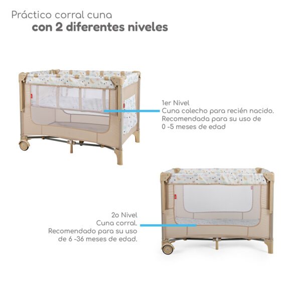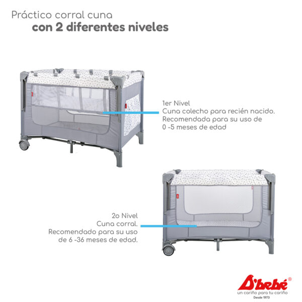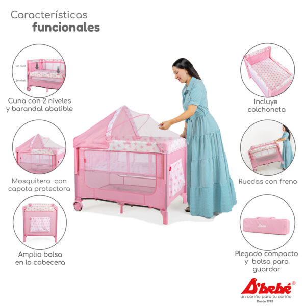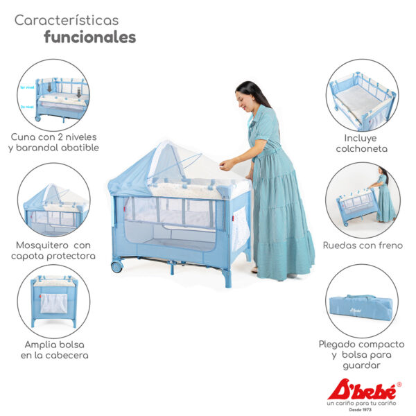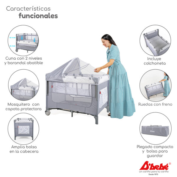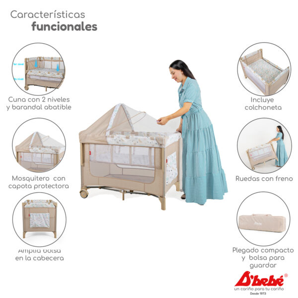 Cuna corral con velo mosquitero que cubre totalmente la cuna, con bolsa de viaje, ideal para espacios pequeños, con cambiador alto y espacio para guardar accesorios.