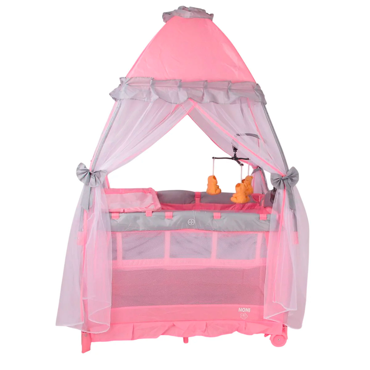 Cuna corral con velo mosquitero que cubre totalmente la cuna, con bolsa de viaje, ideal para espacios pequeños, con cambiador alto y espacio para guardar accesorios.