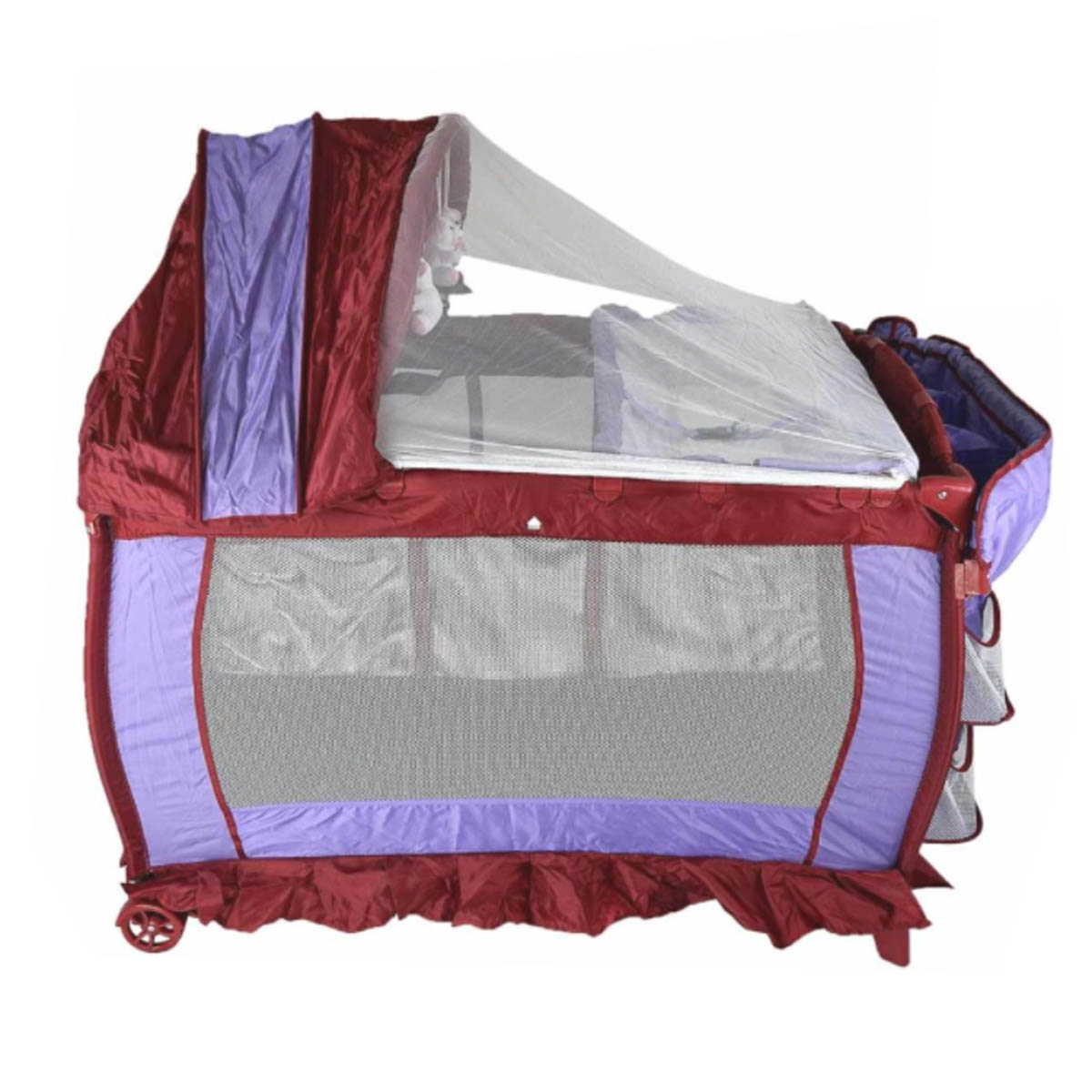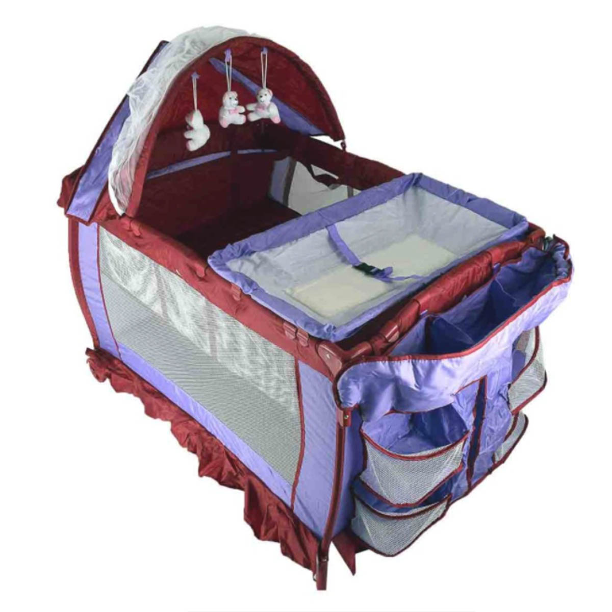 Corral mecedor con móvil, cambiador desmontable y cubre mosquitero, cuenta con un espacio extra para accesorios y pañales.