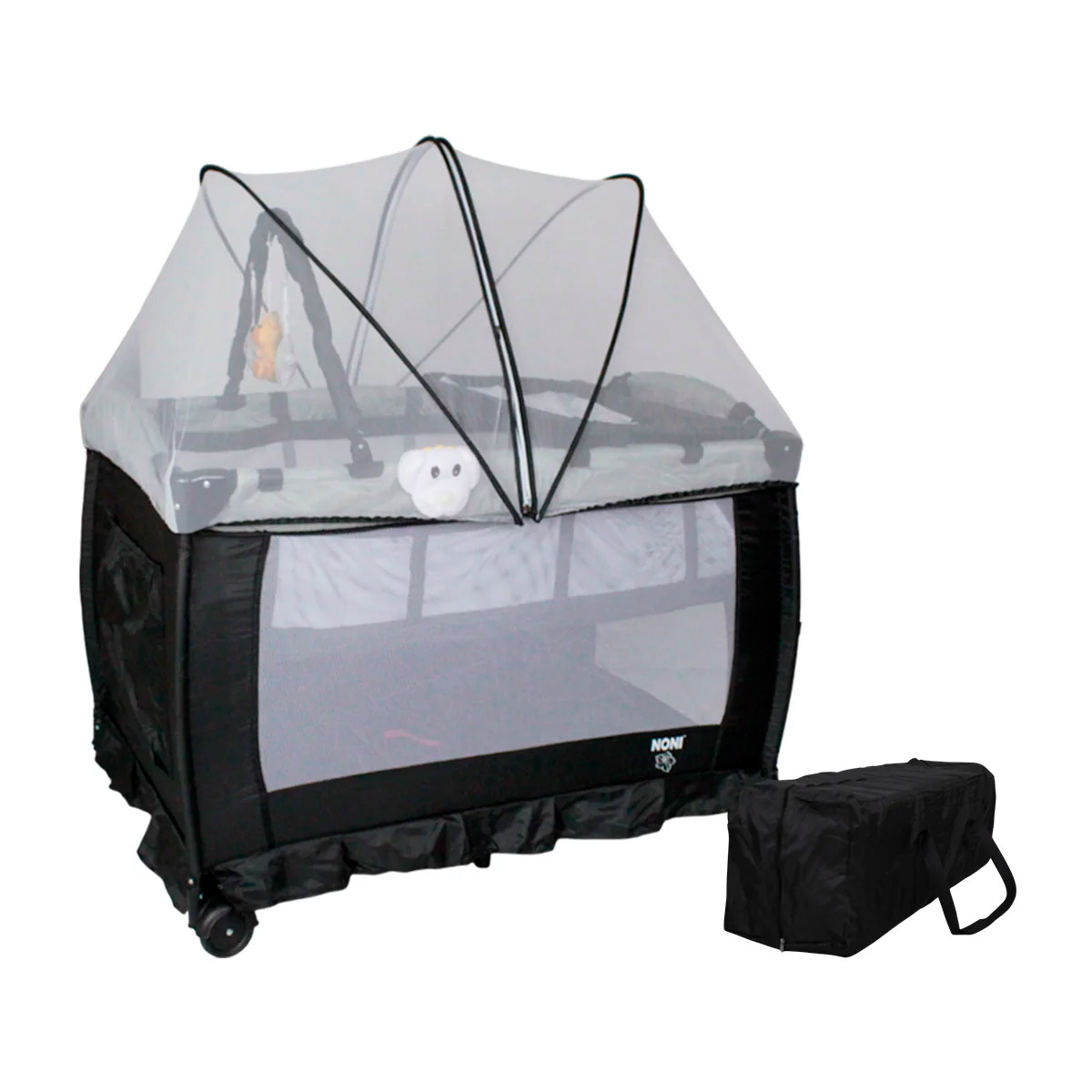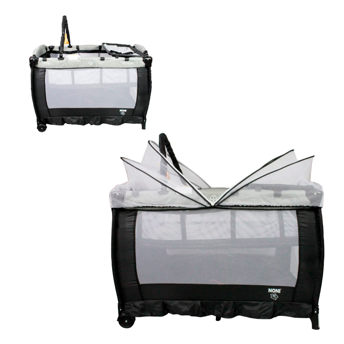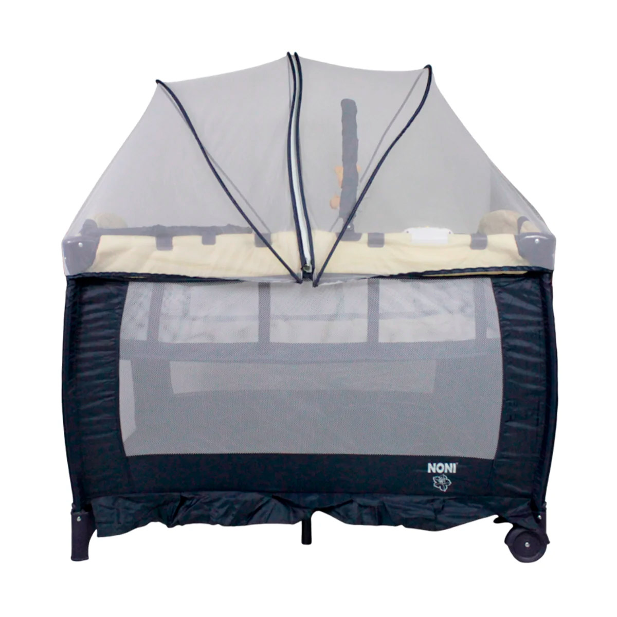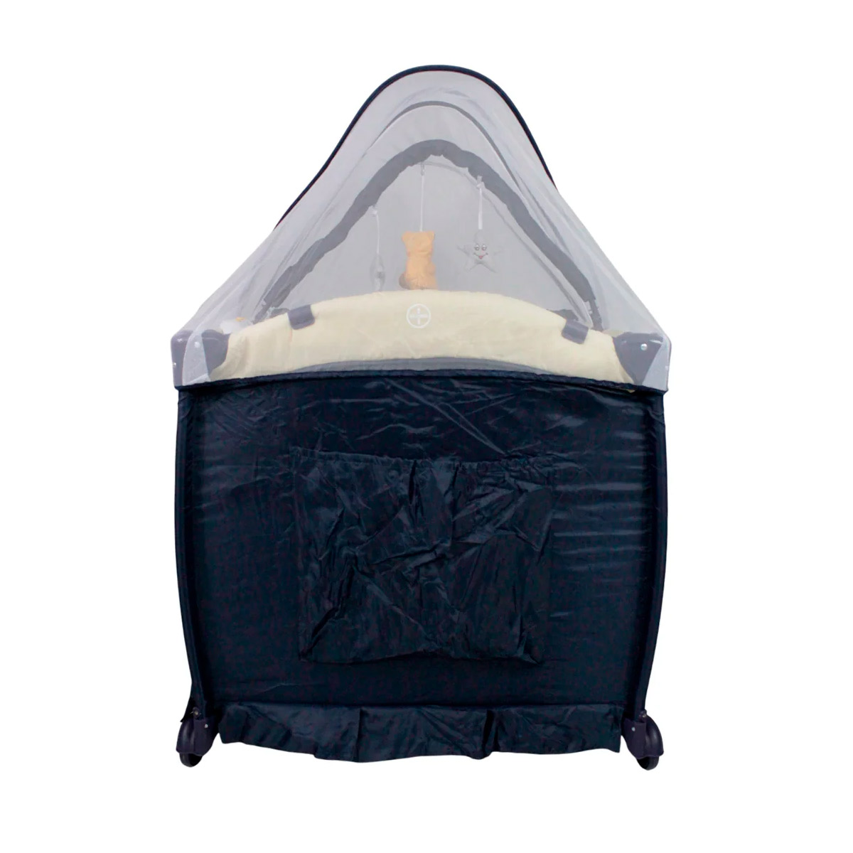 Cuna corral con velo mosquitero que cubre totalmente la cuna, con bolsa de viaje, ideal para espacios pequeños, con cambiador alto y espacio para guardar accesorios.