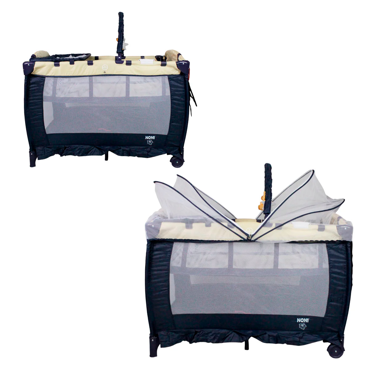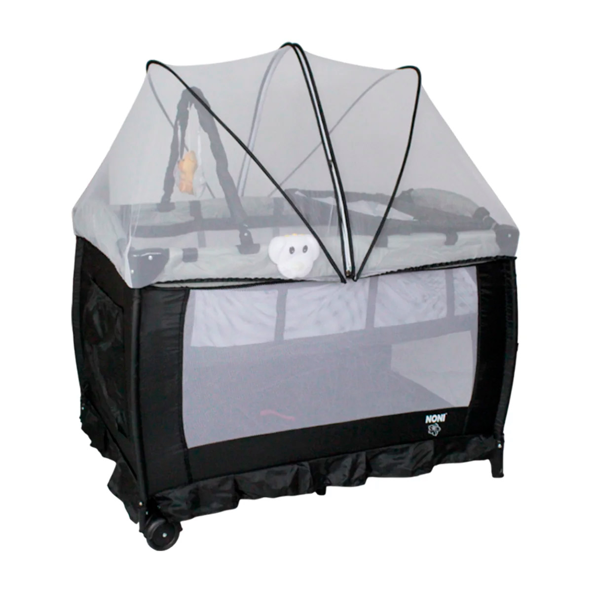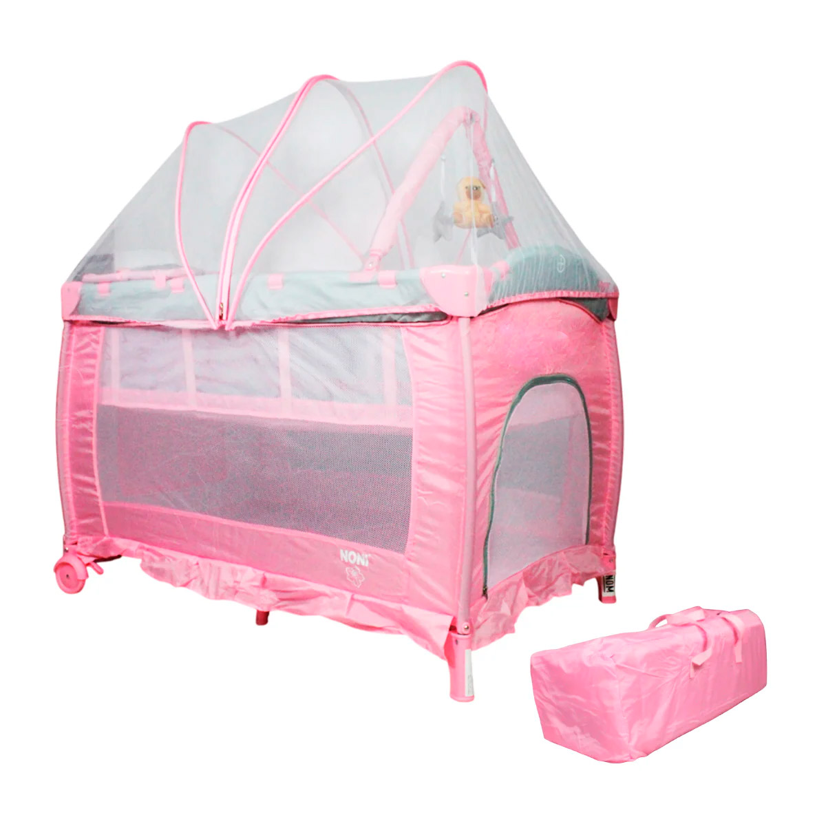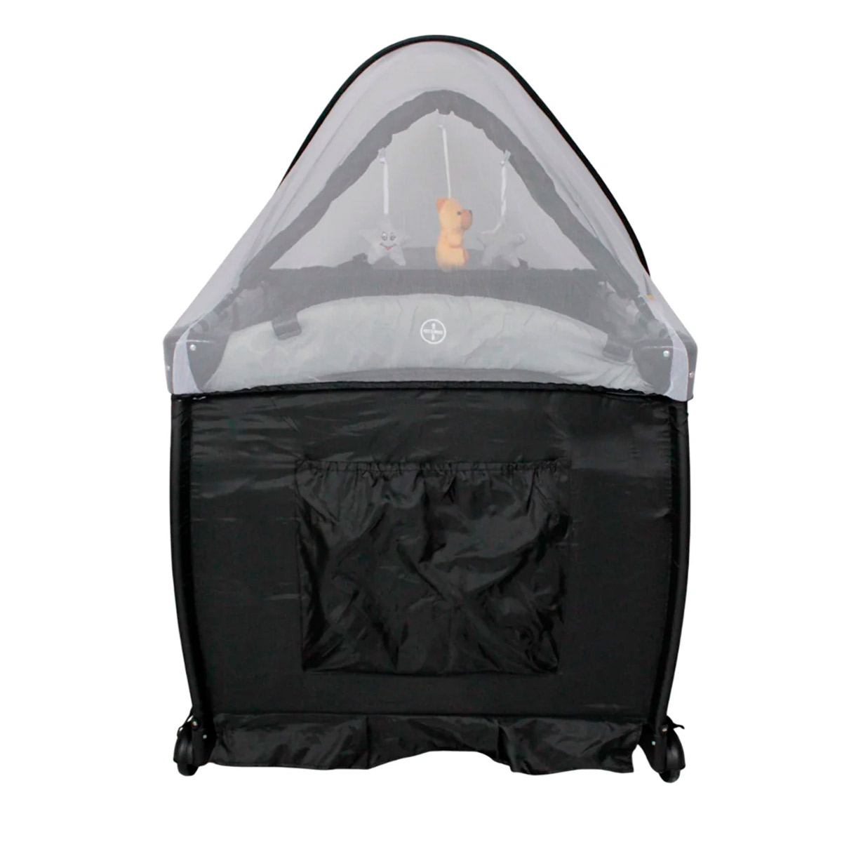 Cuna corral con velo mosquitero que cubre totalmente la cuna, con bolsa de viaje, ideal para espacios pequeños, con cambiador alto y espacio para guardar accesorios.