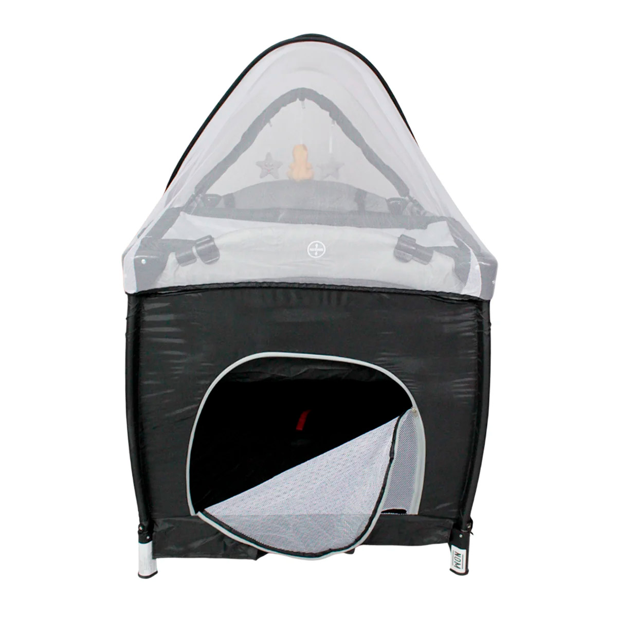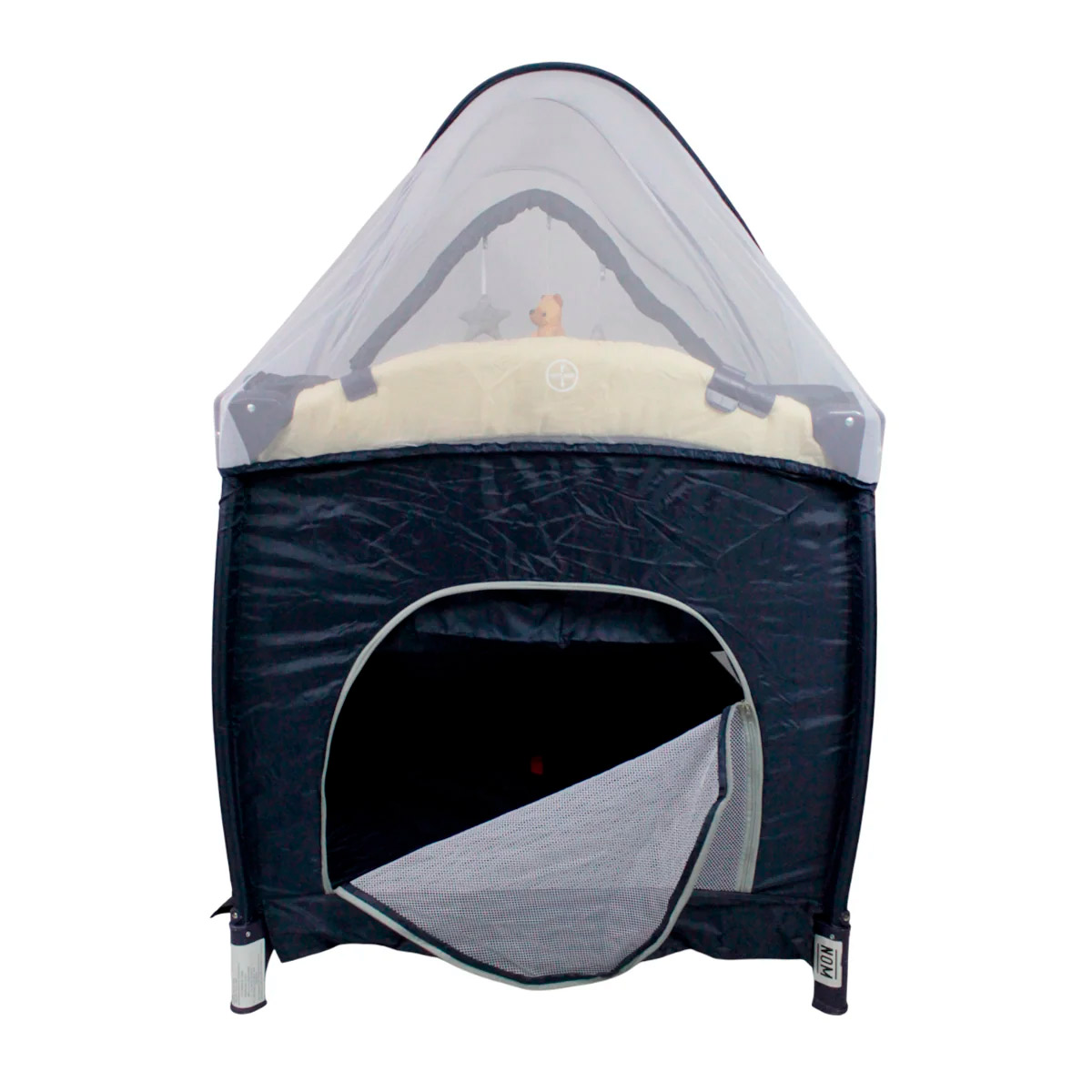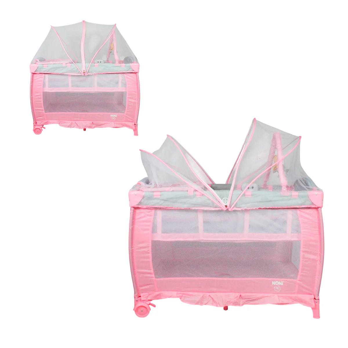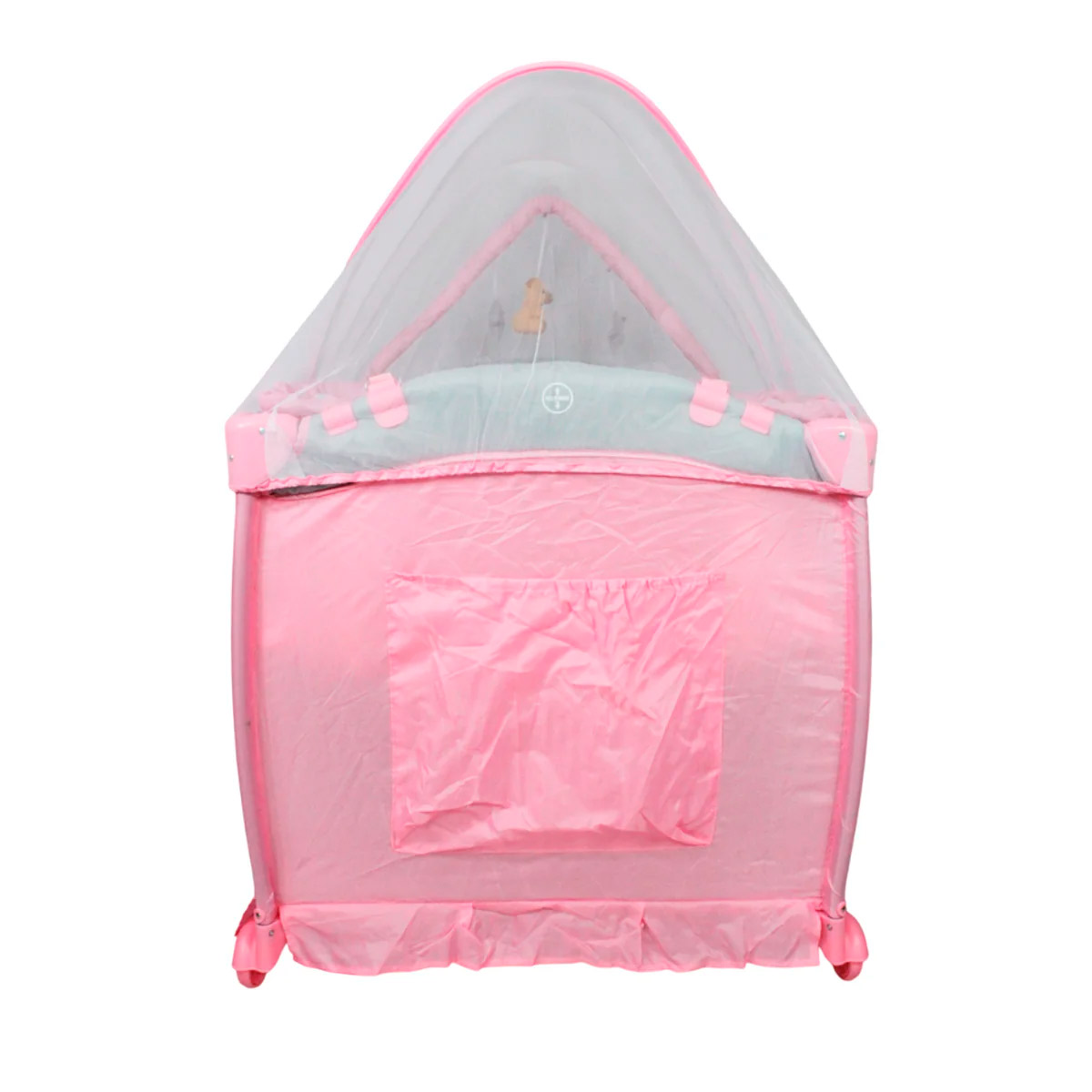 Cuna corral con velo mosquitero que cubre totalmente la cuna, con bolsa de viaje, ideal para espacios pequeños, con cambiador alto y espacio para guardar accesorios.