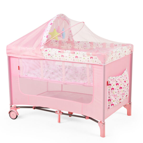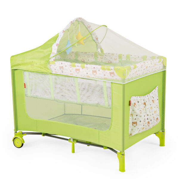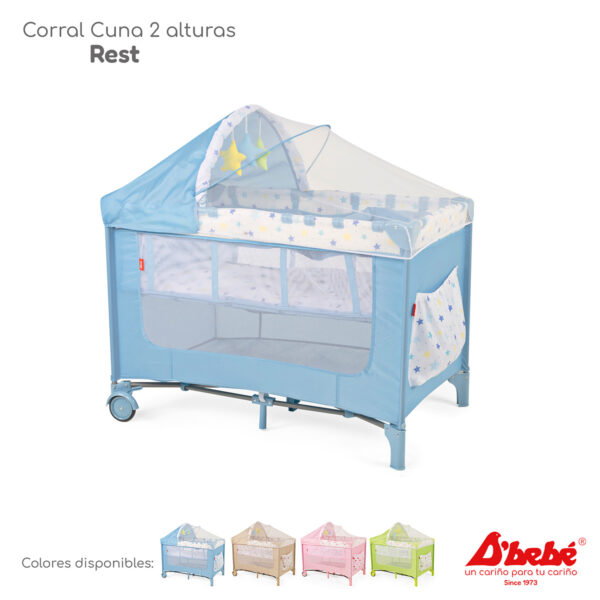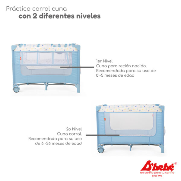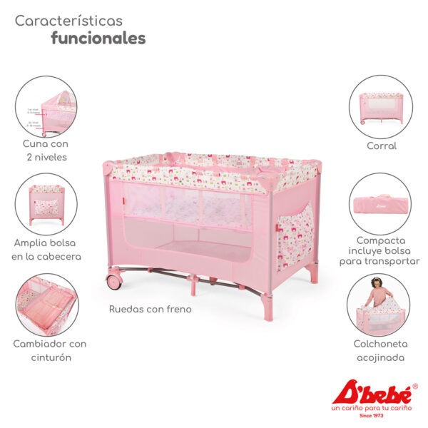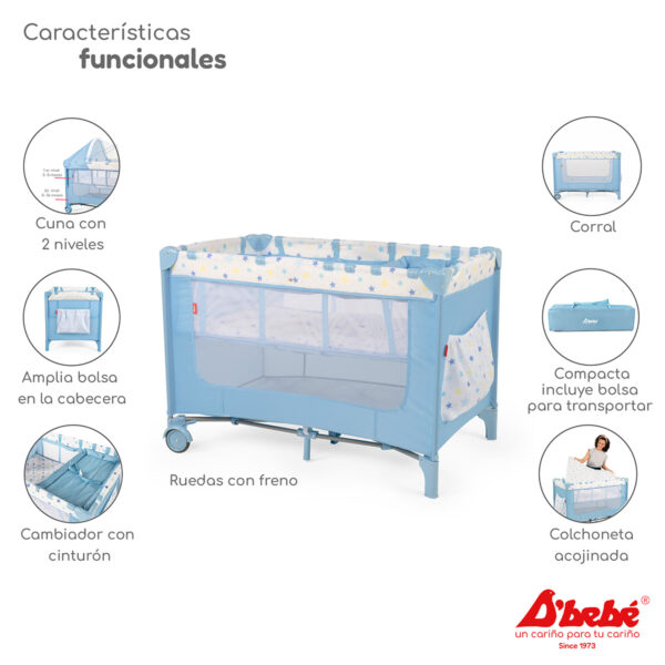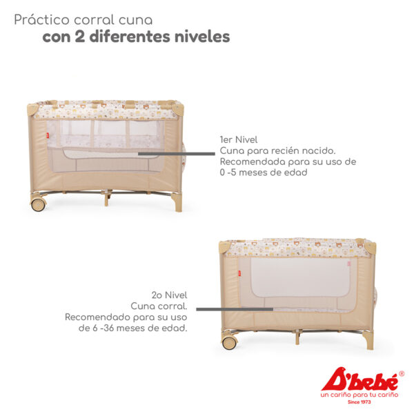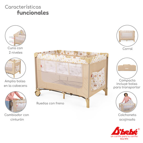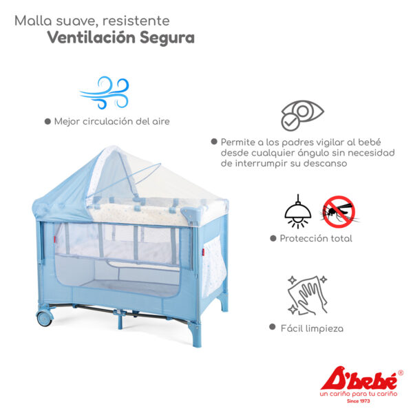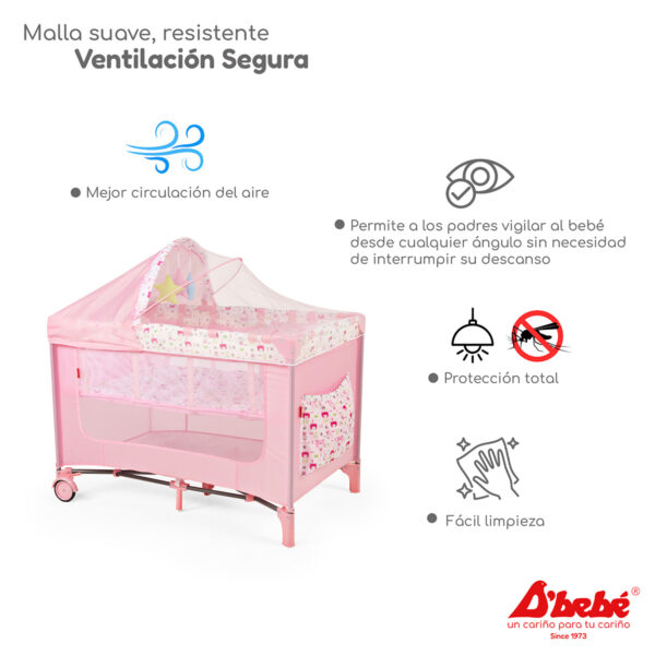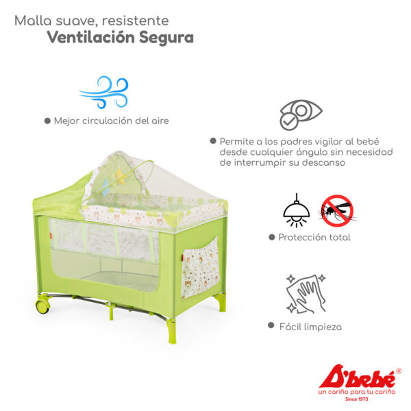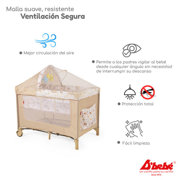 Cuna corral con velo mosquitero que cubre totalmente la cuna, con bolsa de viaje, ideal para espacios pequeños, con cambiador alto y espacio para guardar accesorios.