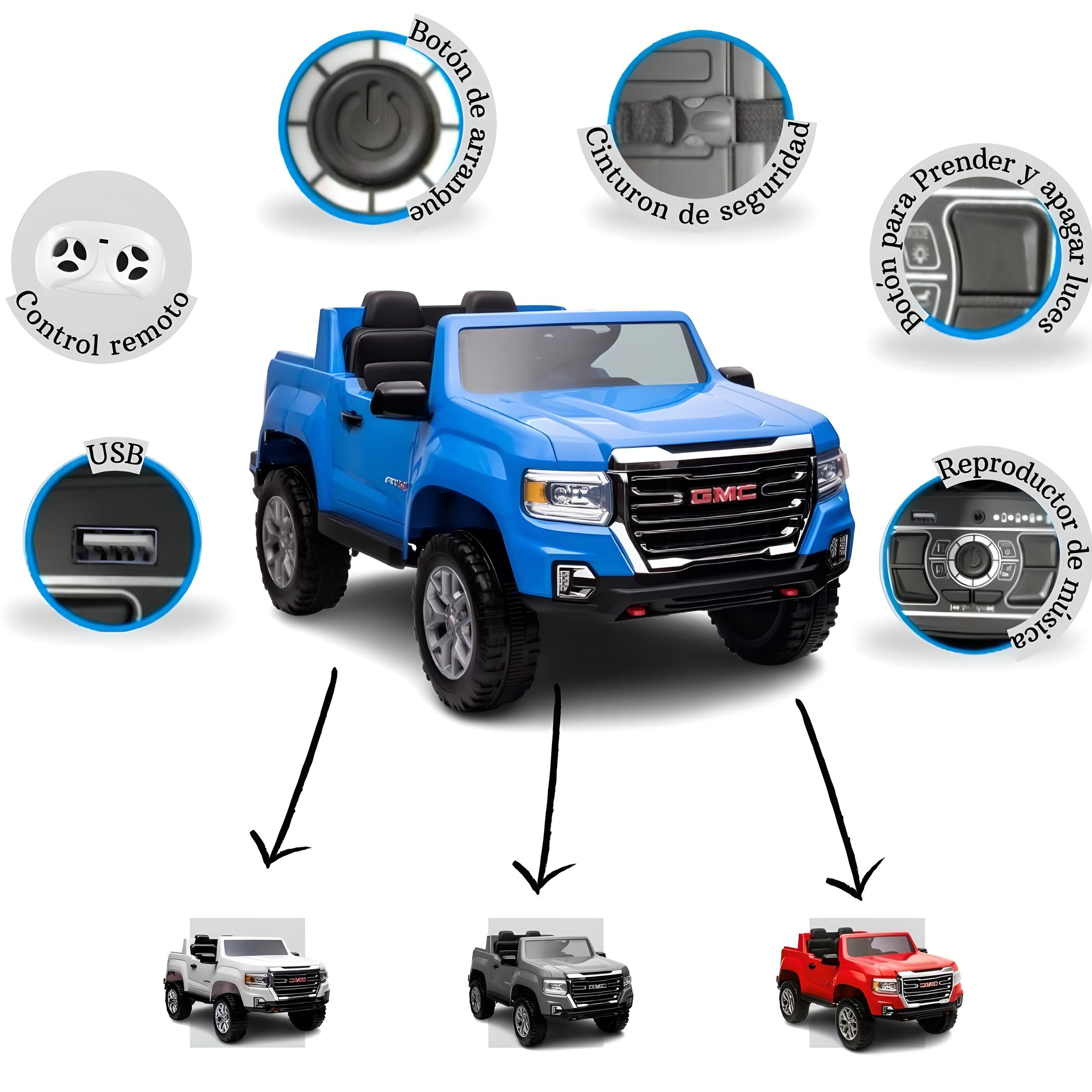 Carro montable eléctrico GMC Canyon AT4, batería recargable de 12V y control remoto.