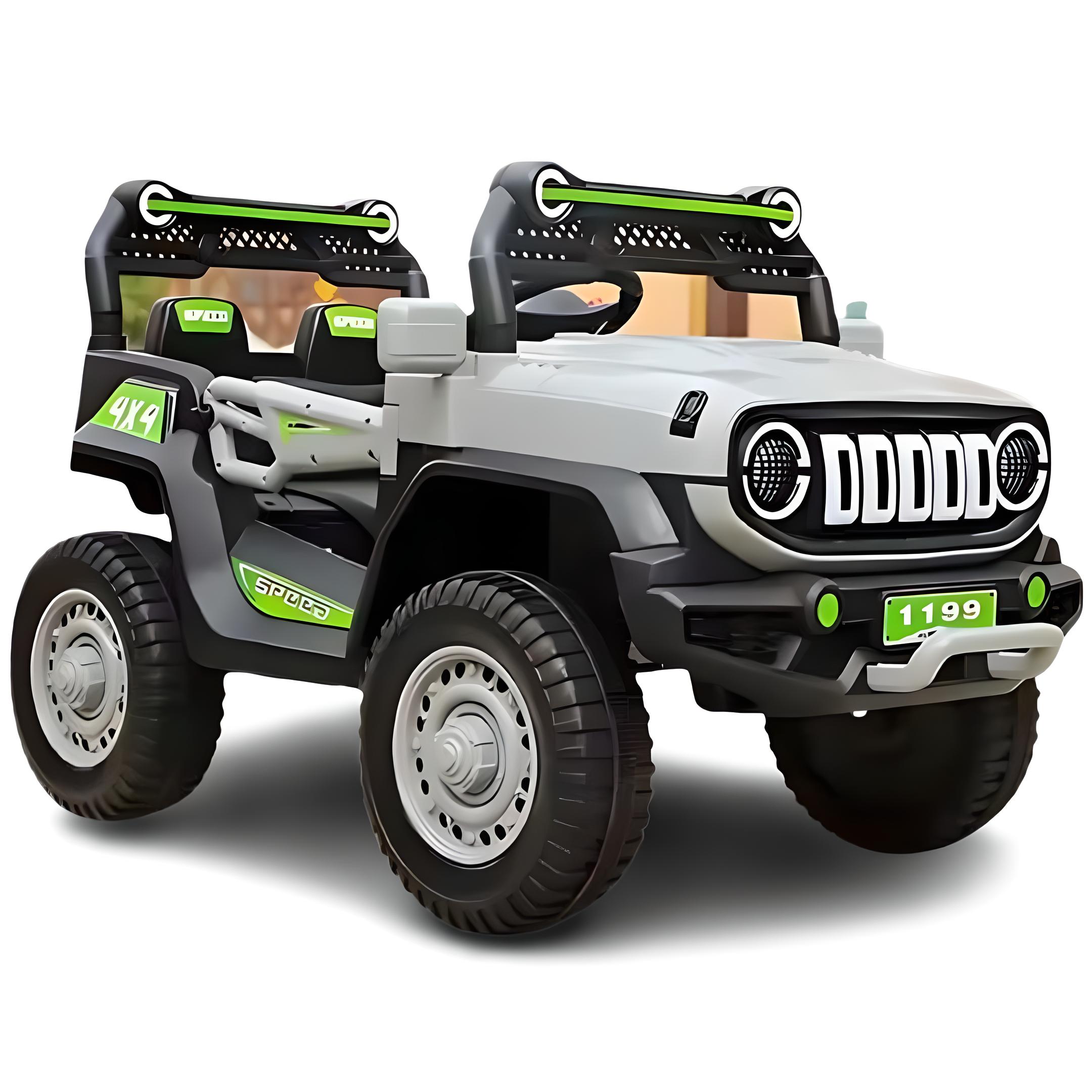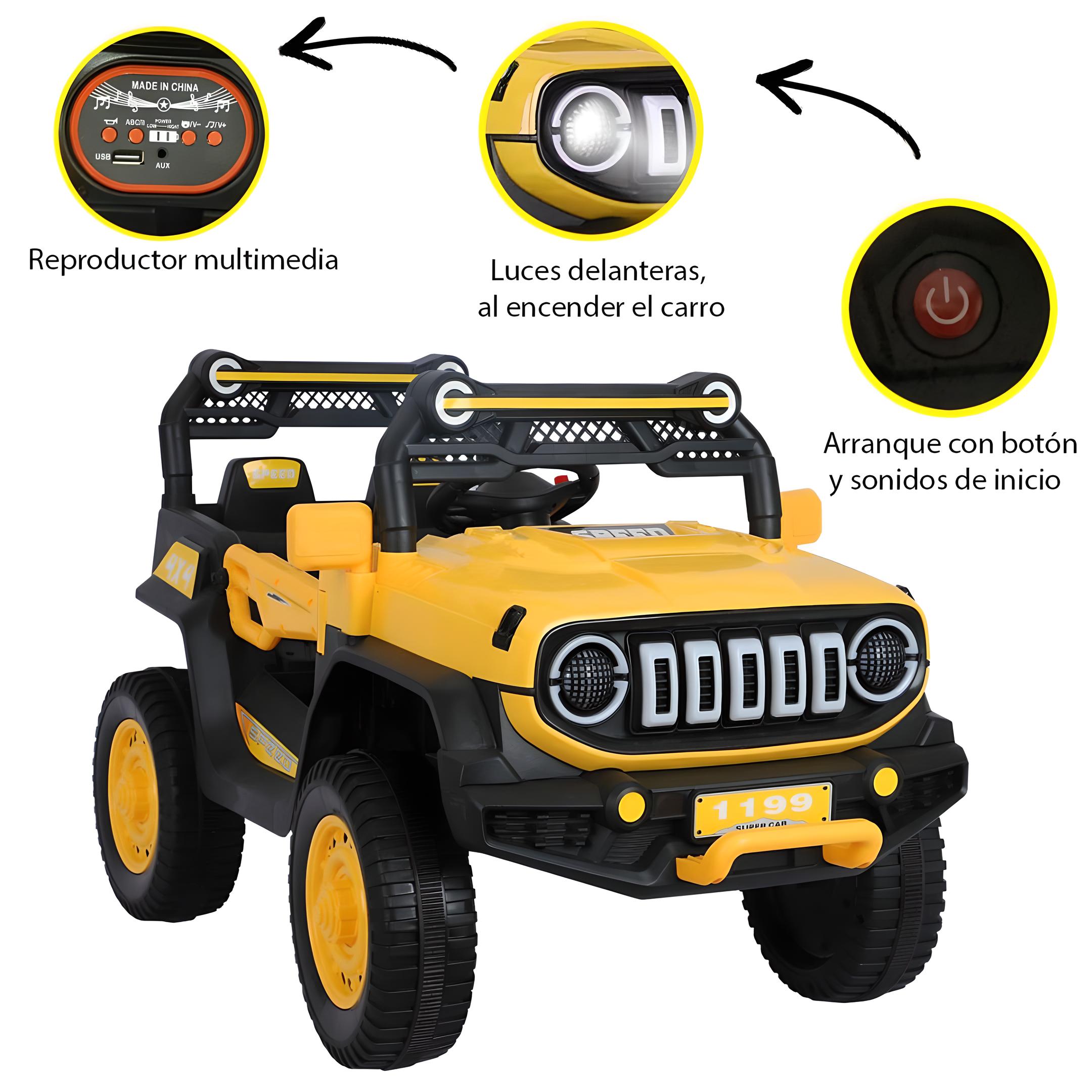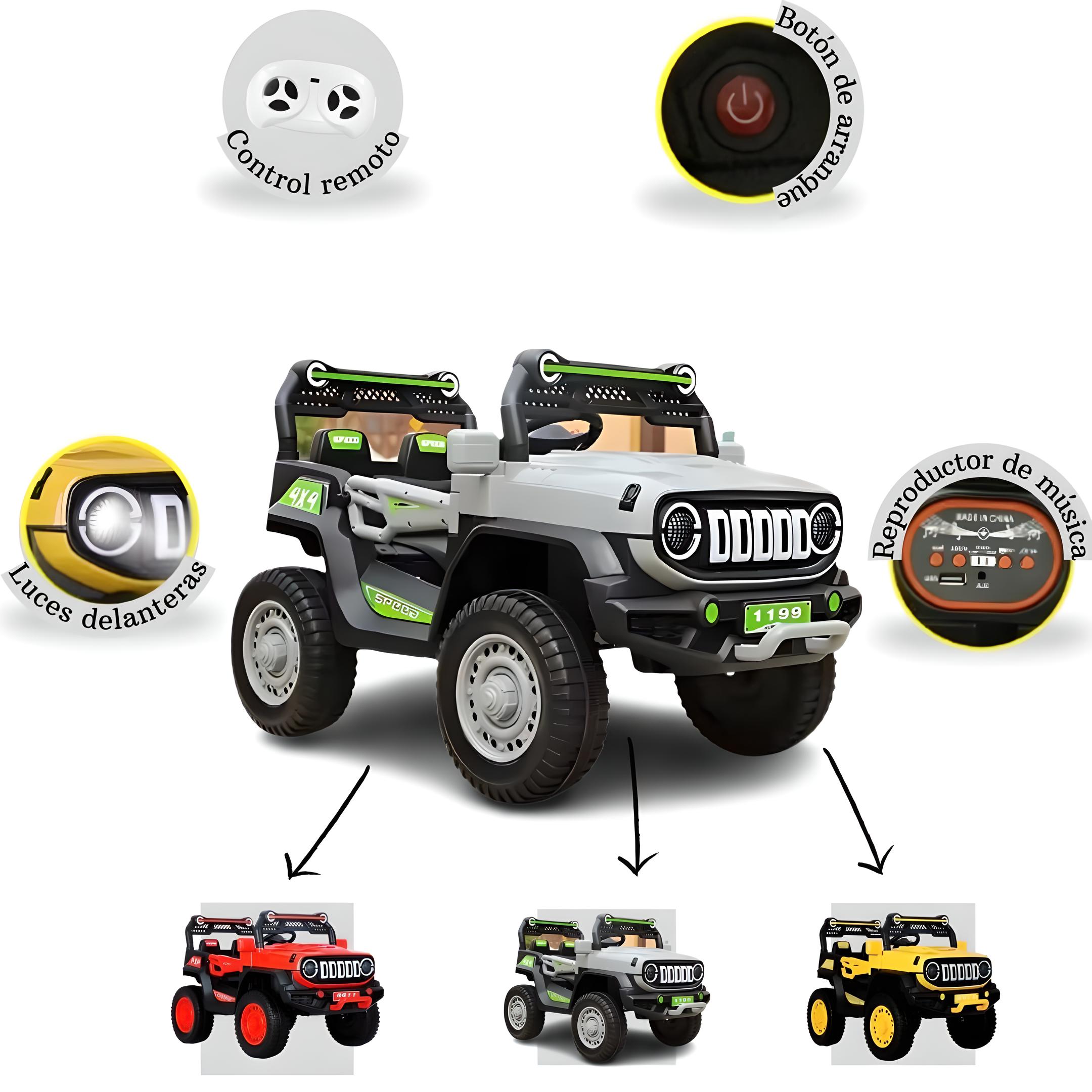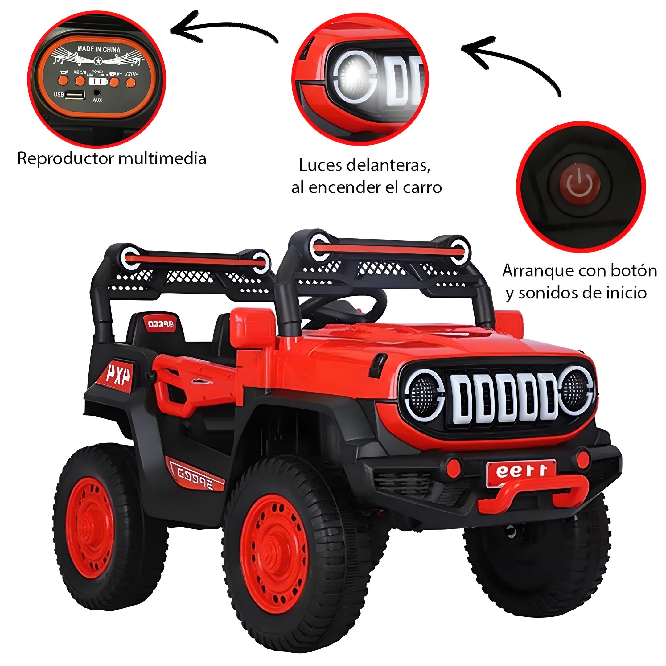 Vehículo eléctrico tipo Jeep con batería de 12V y motor de 2 velocidades, alcanza hasta 8 km/h.