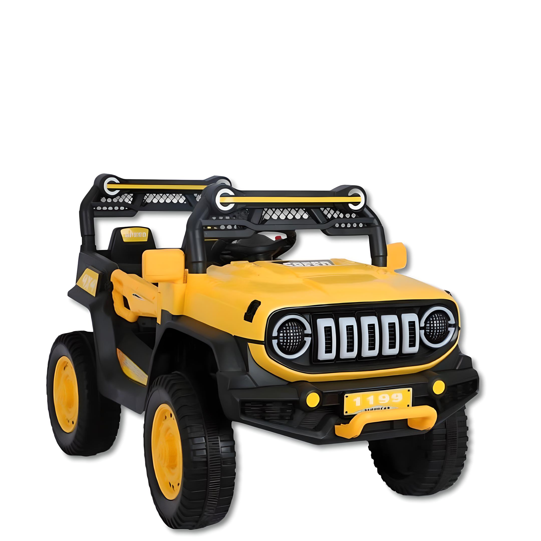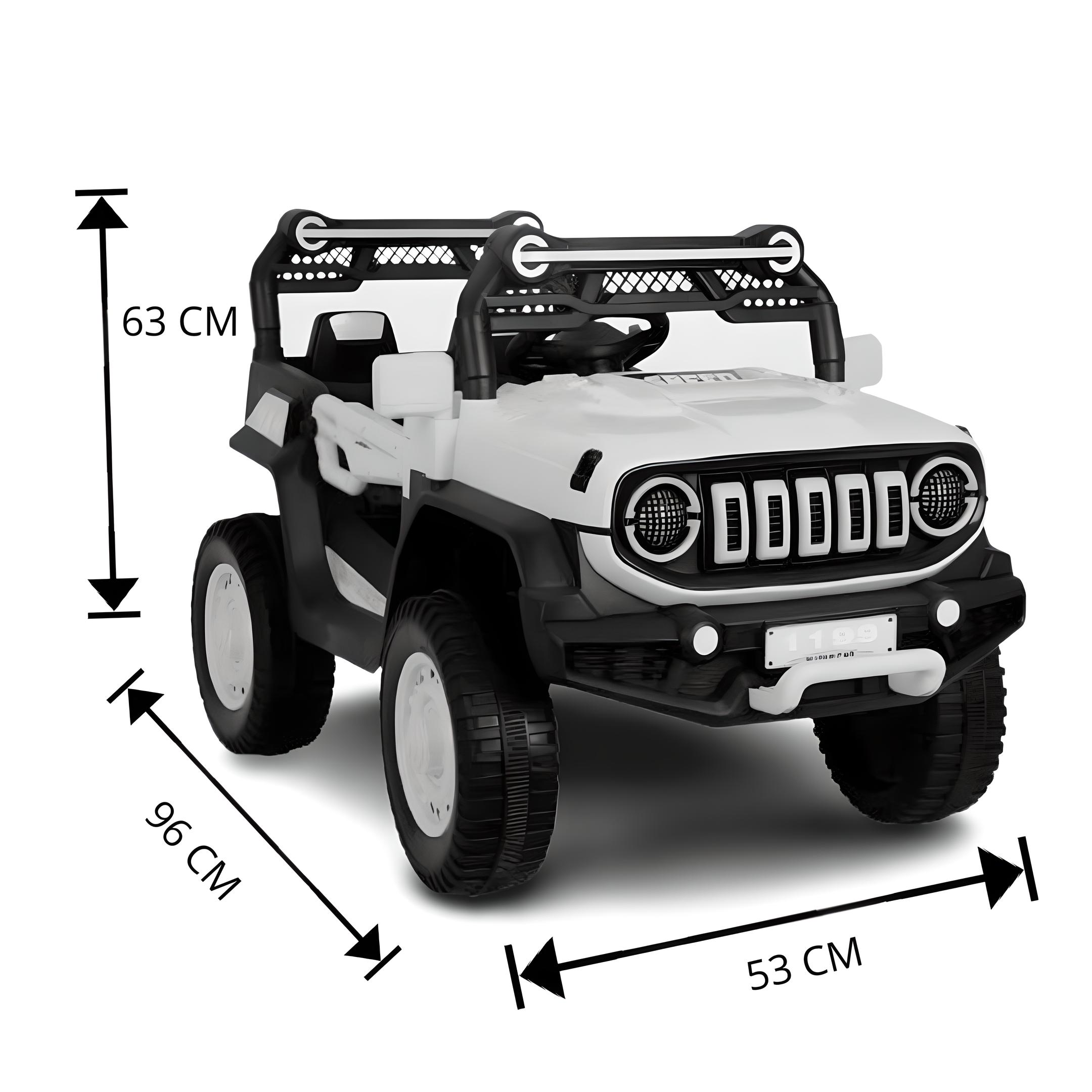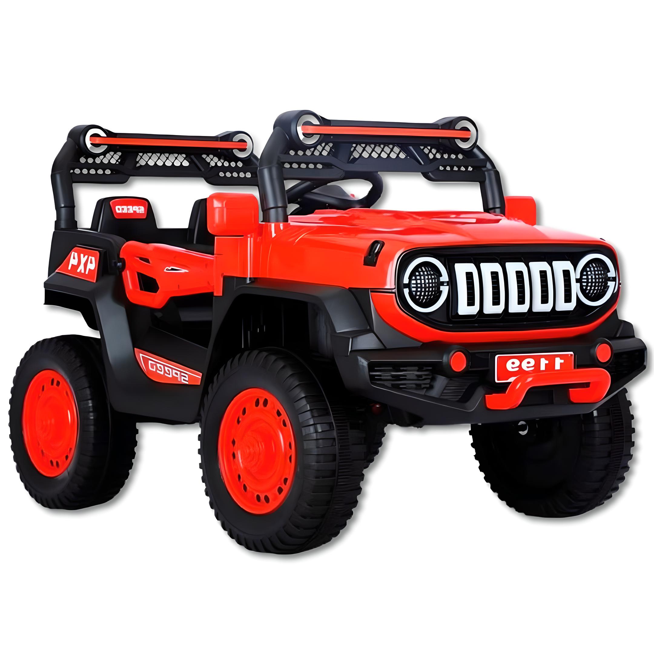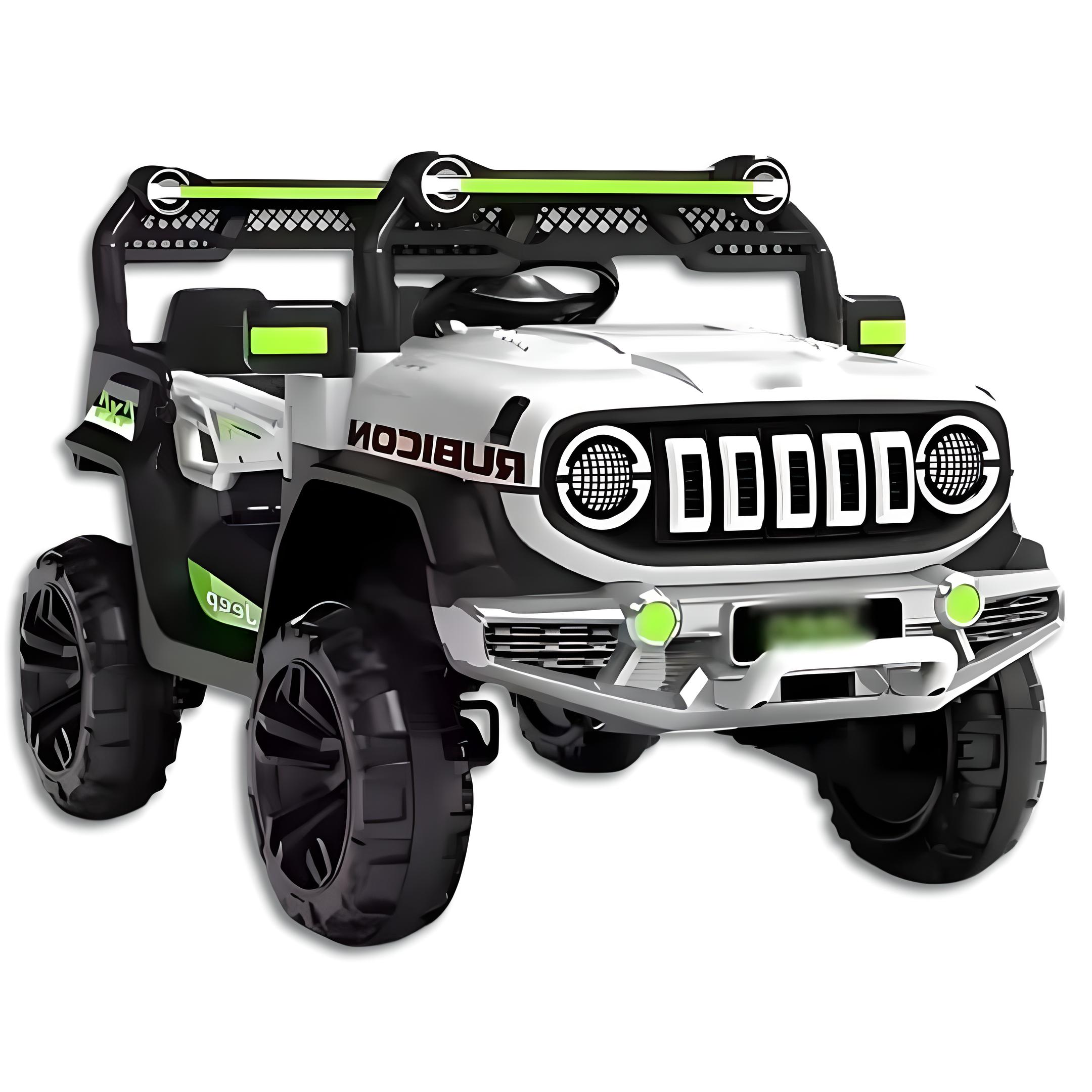 Vehículo eléctrico tipo Jeep con batería de 12V y motor de 2 velocidades, alcanza hasta 8 km/h.