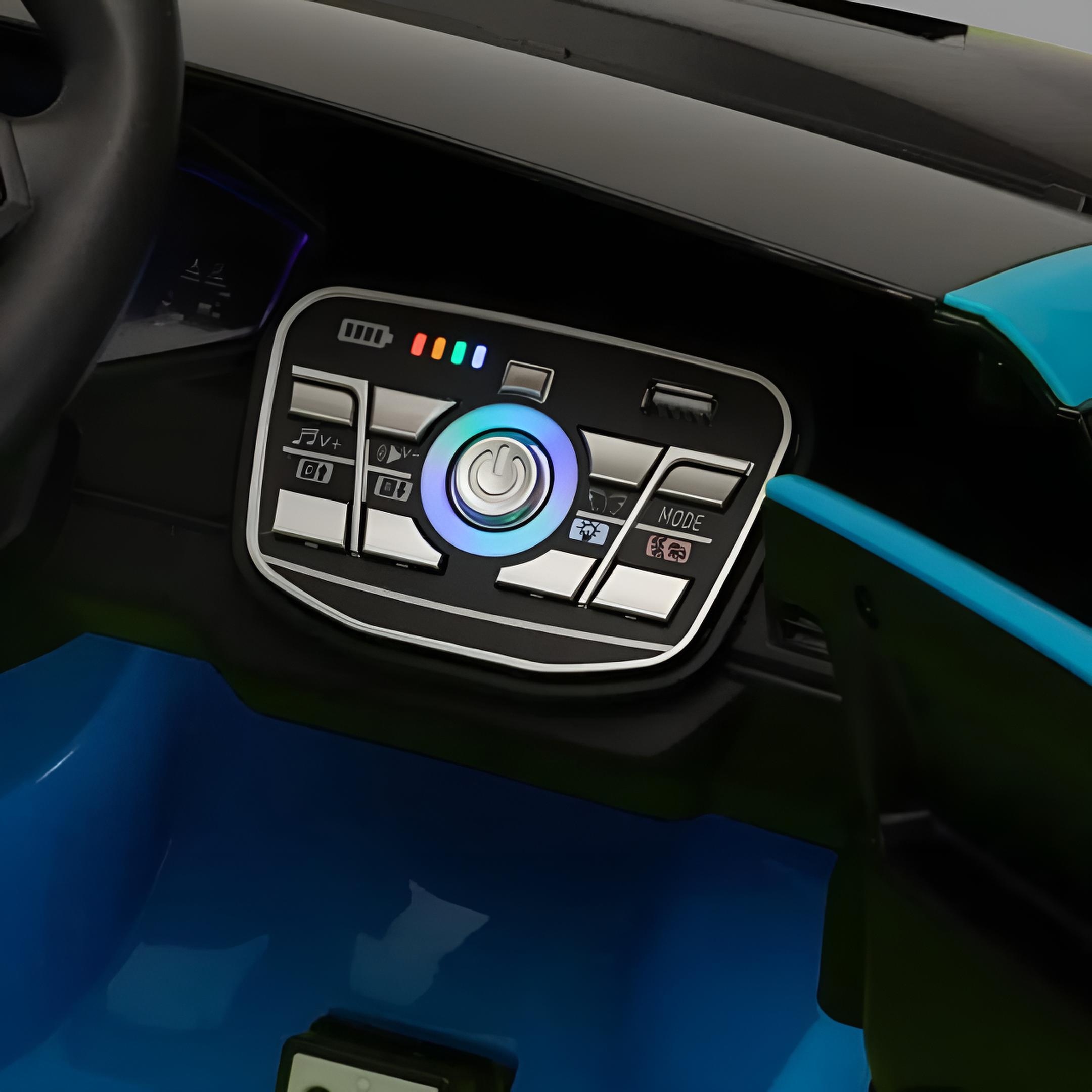 Incluye luces LED, función de mecedora y puerto USB para música, ofreciendo diversión y seguridad en un diseño deportivo.