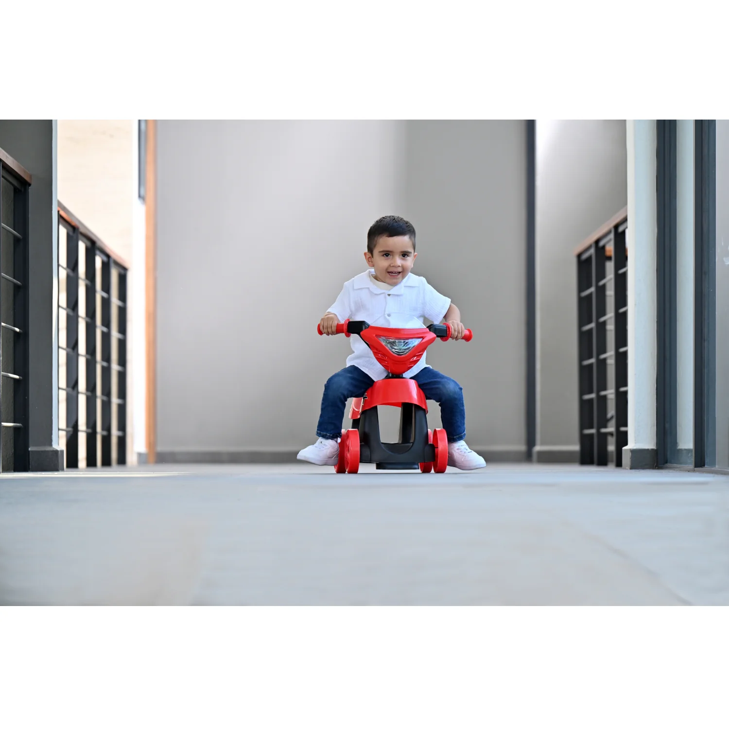 Ruedas: 4 ruedas anchas y estables que brindan seguridad y evitan volcamientos., Asiento ergonómico y cómodo: con respaldo bajo para mayor libertad de movimiento., Manubrio con puños antideslizantes y fácil agarre para las manitas pequeñas., Base: con espacio para apoyar los pies cuando el niño ya domina el deslizamiento., Diseño: ligero y fácil de transportar.