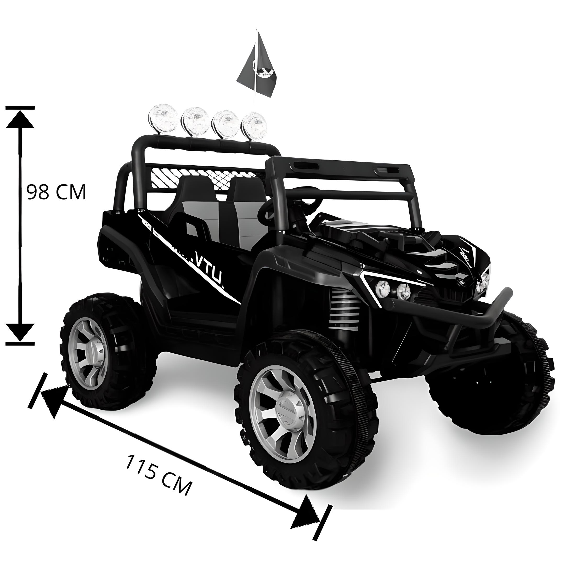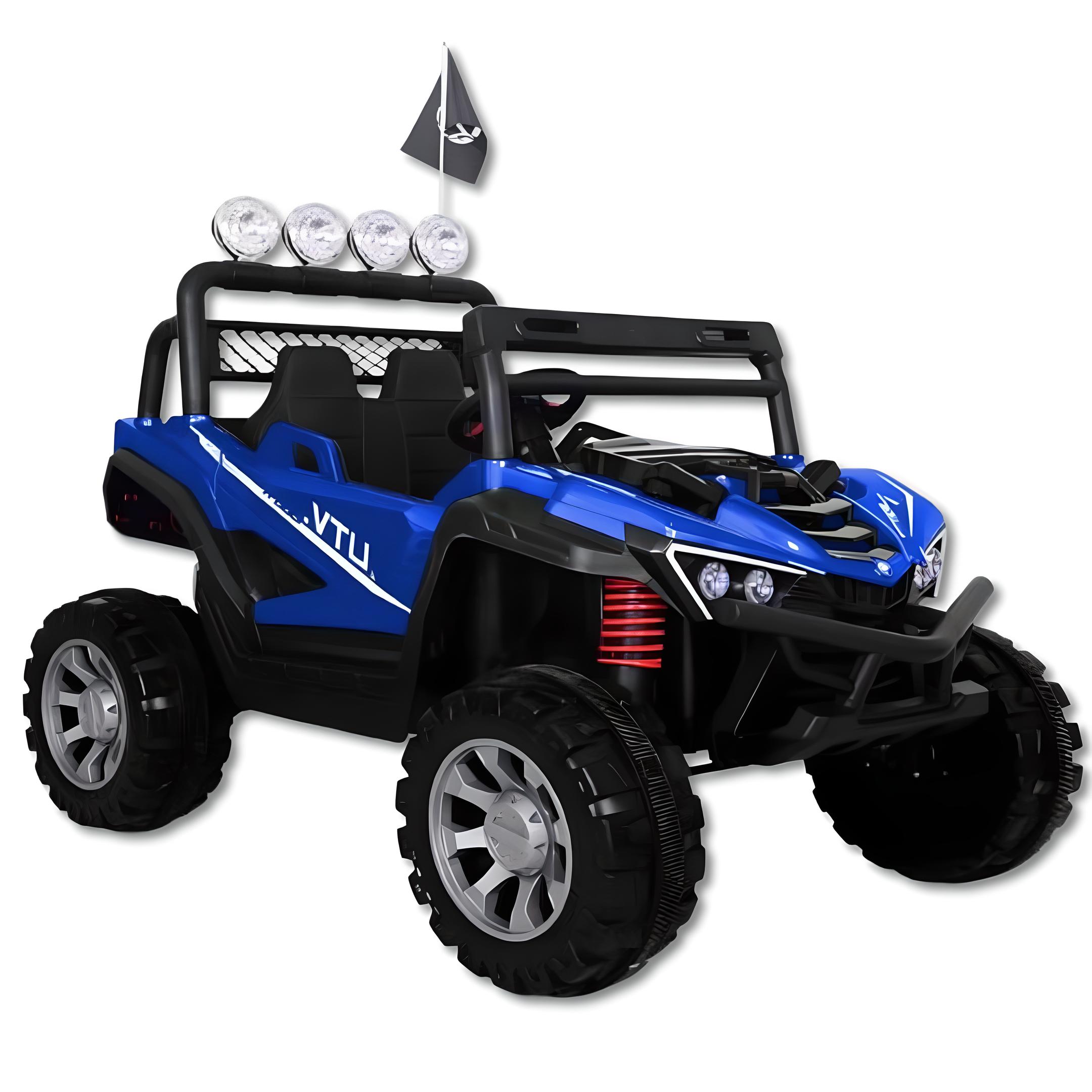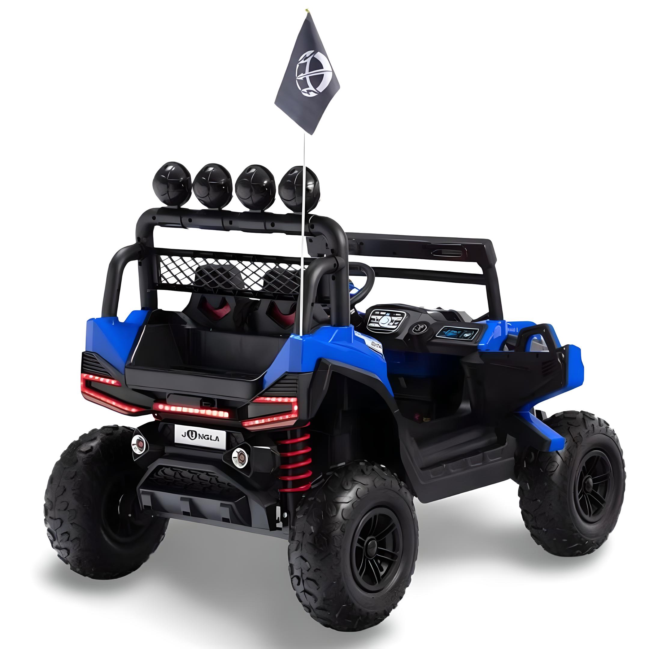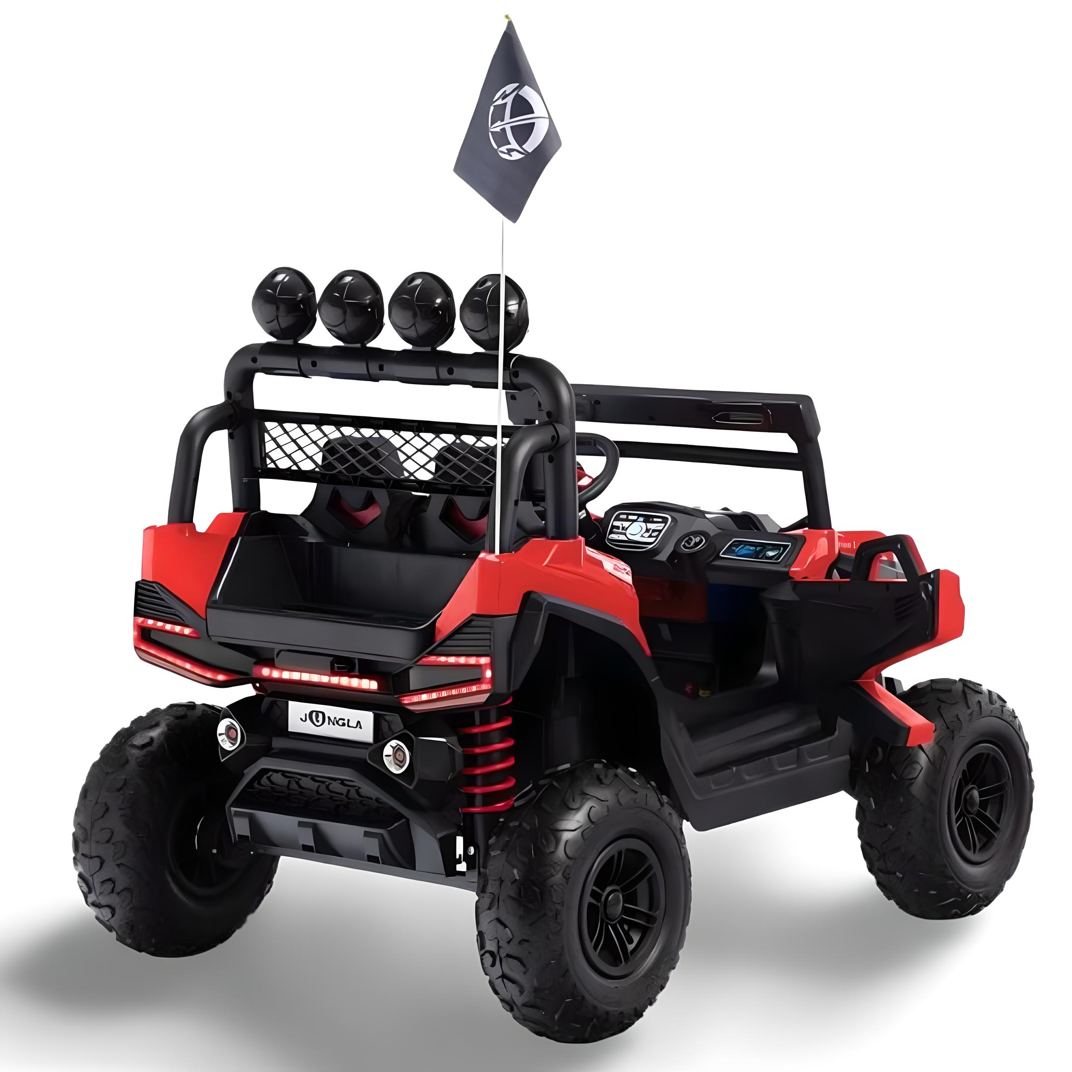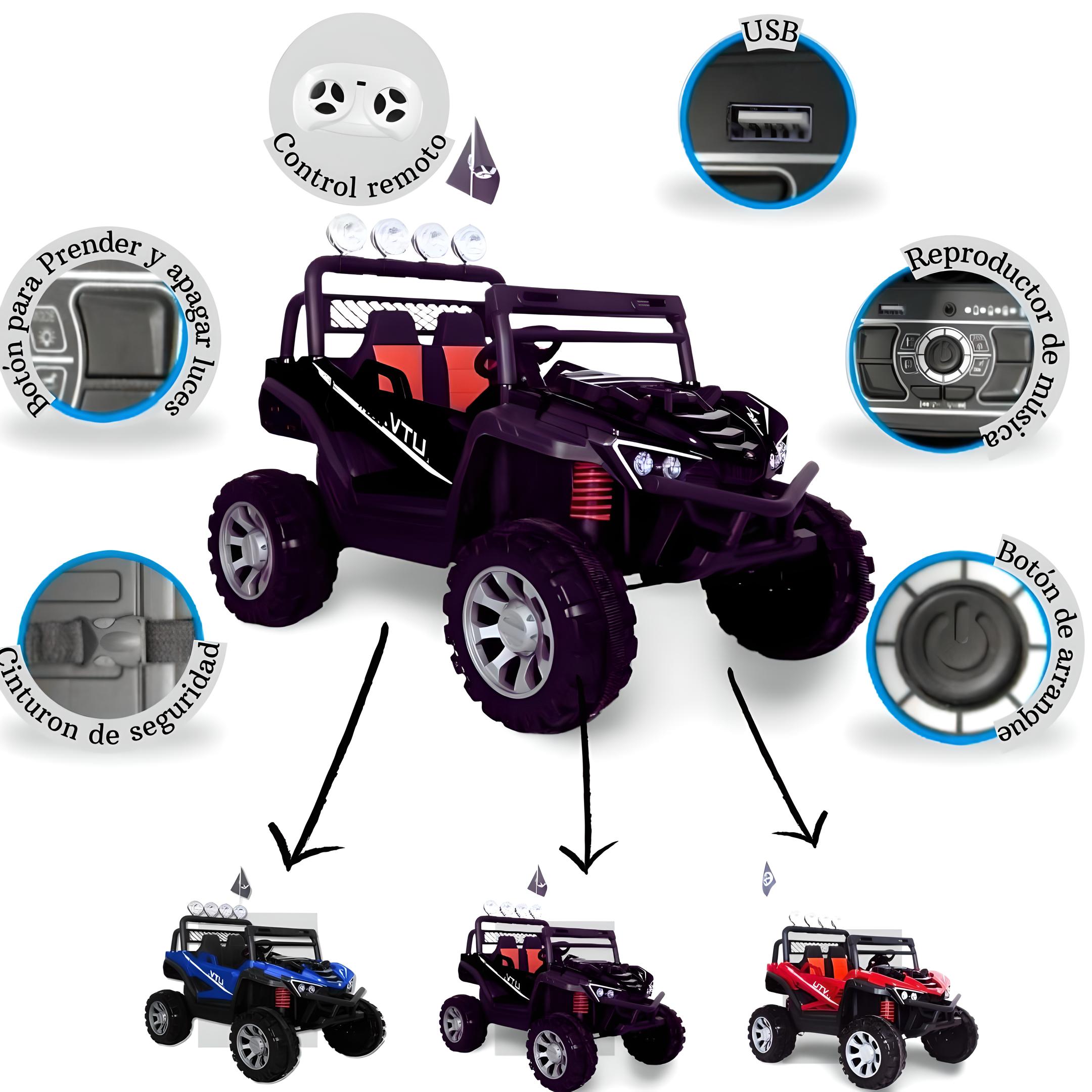 Soporta hasta 35 kg e incluye control remoto con alcance de 20 metros, puertas abatibles, luces LED en faros y parte superior, conexión Bluetooth, puerto USB y auxiliar para entretenimiento completo.