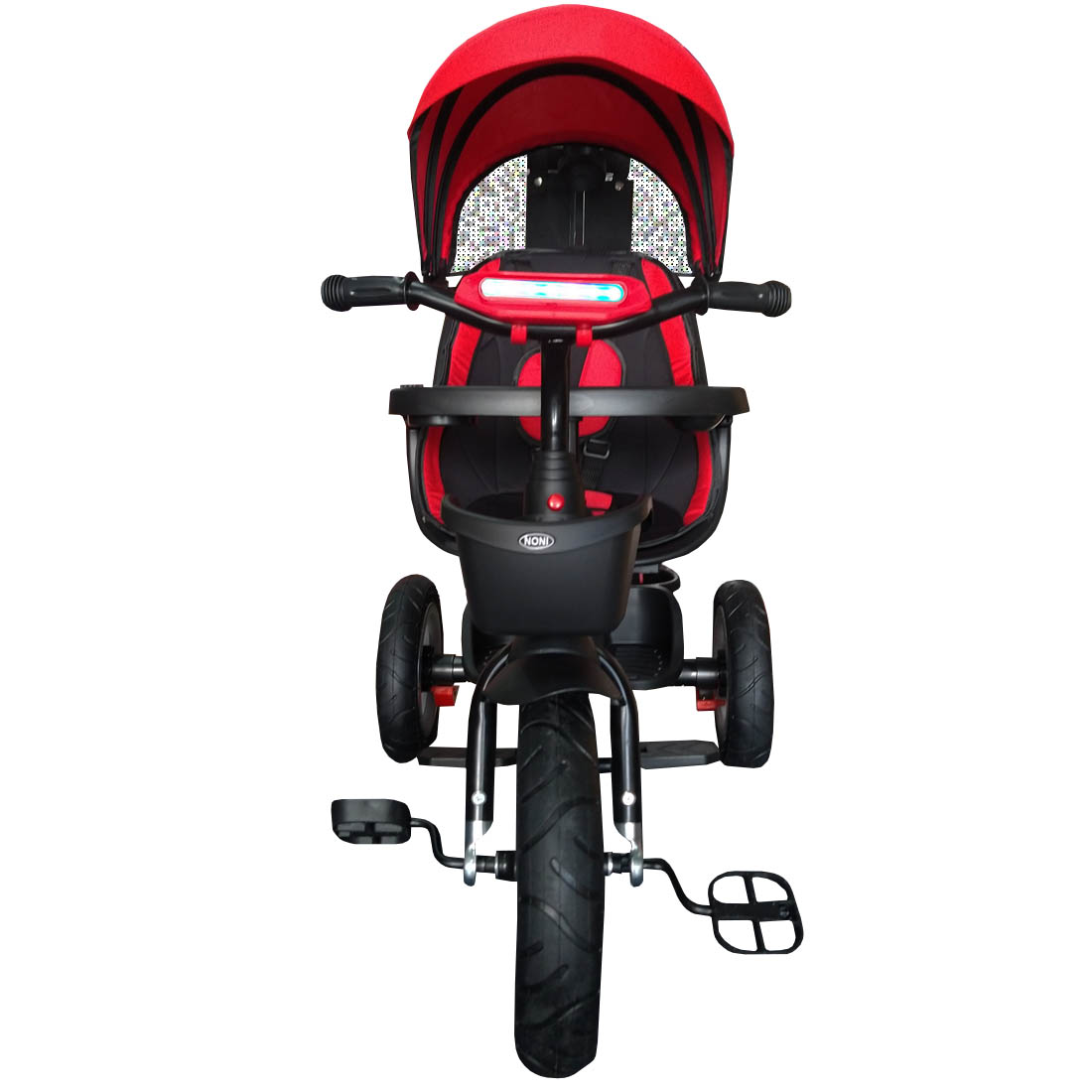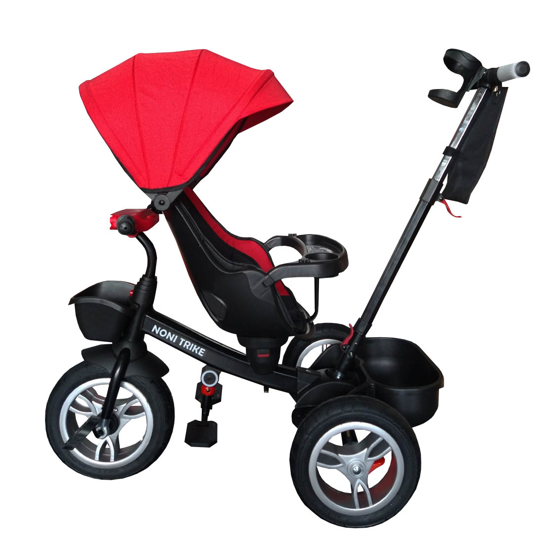 Asiento giratorio 360 grados., Llantas de caucho y aire., Sistema de bastón dirigible., Manubrio con luz y sonido.