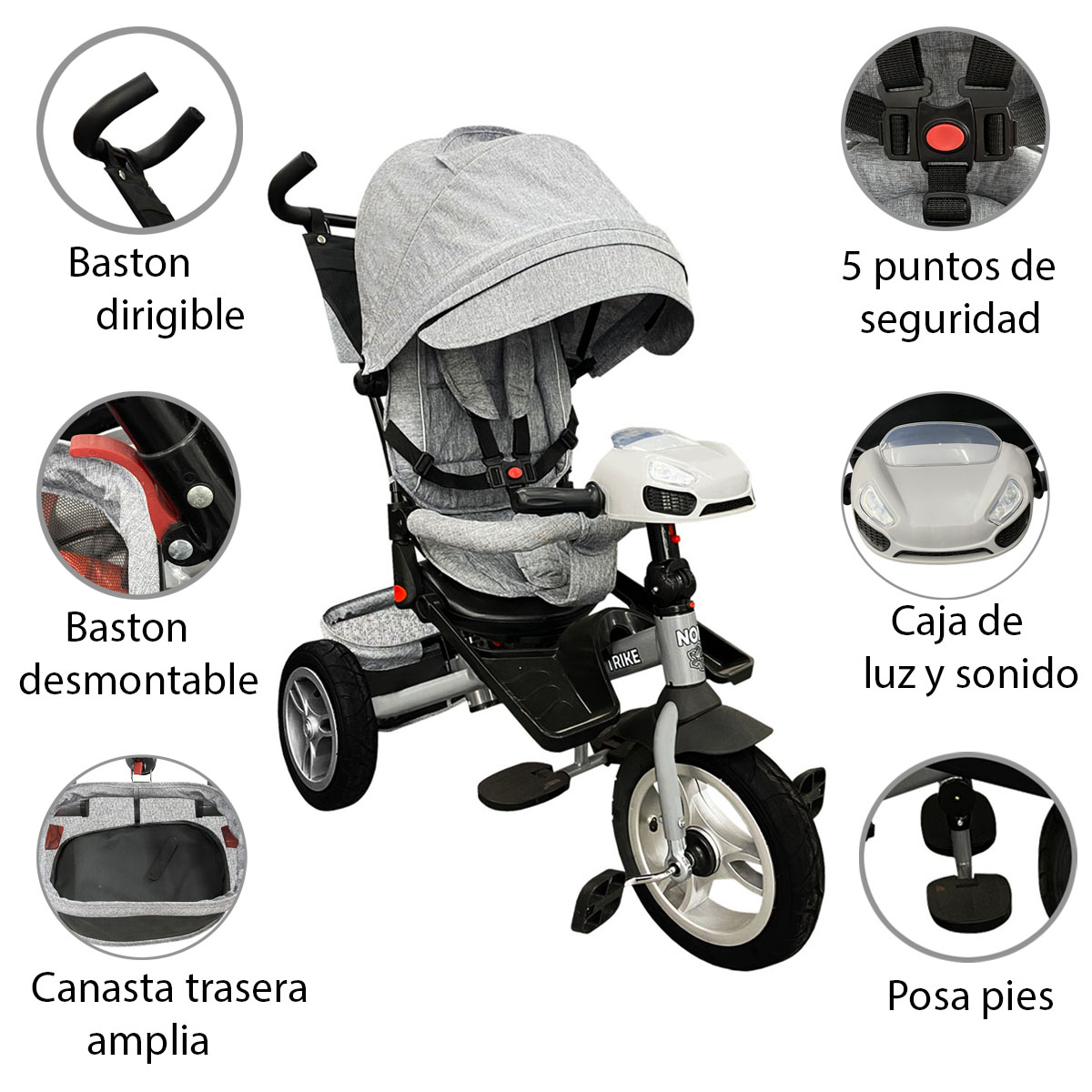 El triciclo es de excelente calidad, resistente y fácil de armar. Es muy funcional y práctico, ideal para la seguridad y comodidad del bebé, permitiendo llevarlo frente a ti para mayor control. Los materiales son de alta calidad y el diseño cumple con las expectativas, siendo muy apreciado por su estética y funcionalidad.