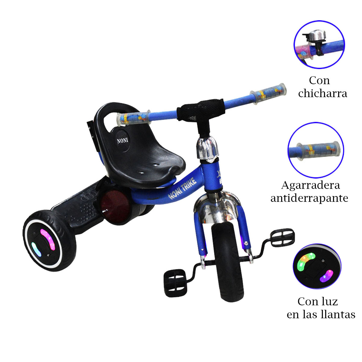 Triciclo Musical con Luz en las 3 llantas de EVA, manubrio con cubierta, estructura de metal.